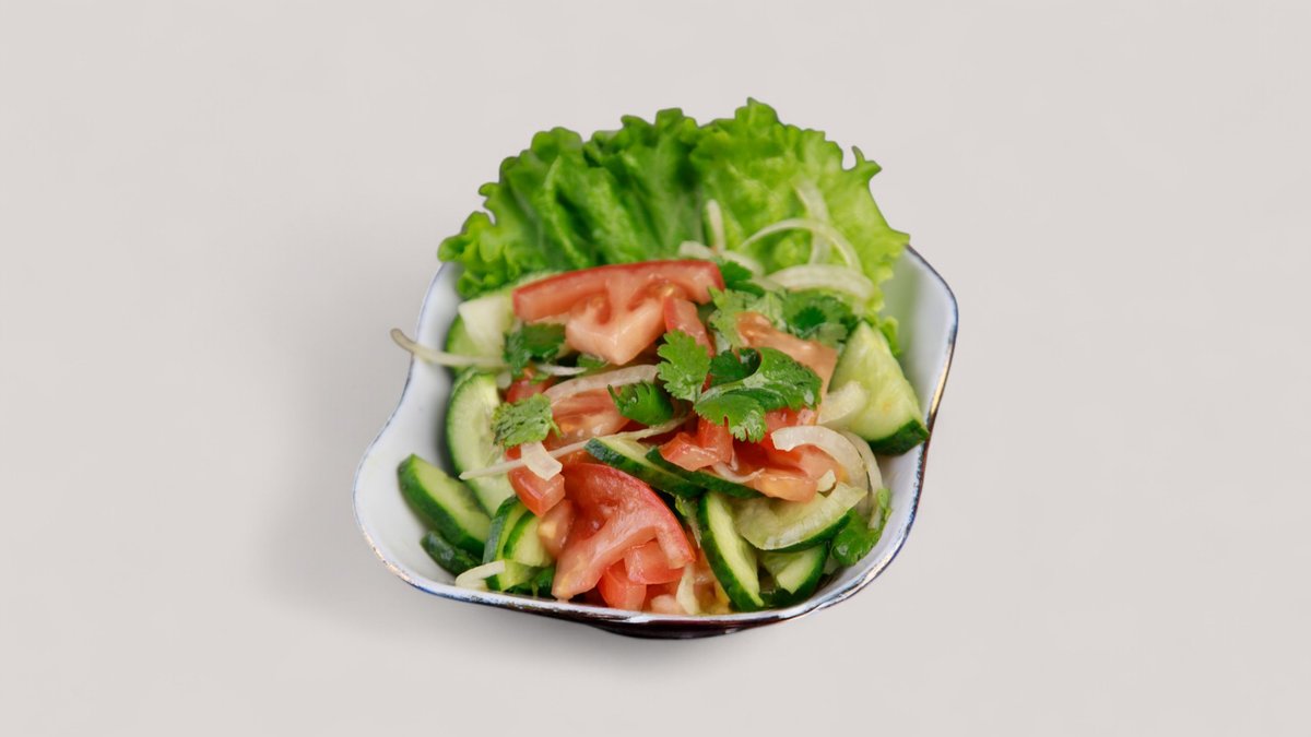 Микс листьев салата, помидор, огурец, перец, вырезка телятины, обжаренная в кунжуте. Остро-сладкий соус с ароматом чеснока, чили и кунжута. Порция: 250 гр.