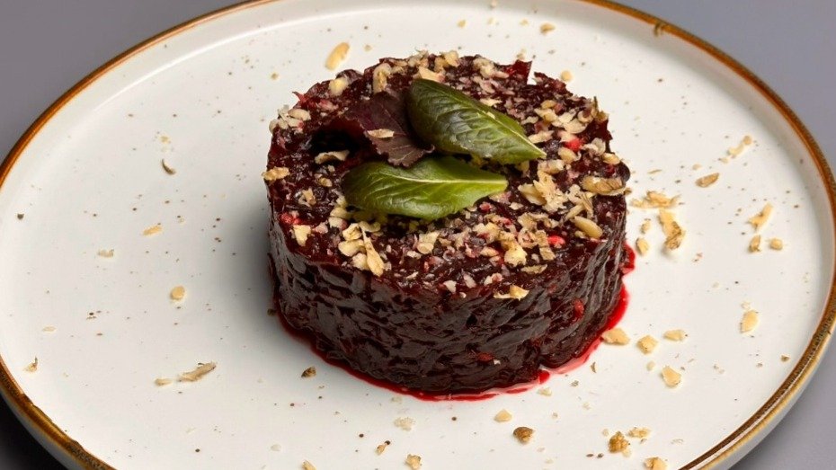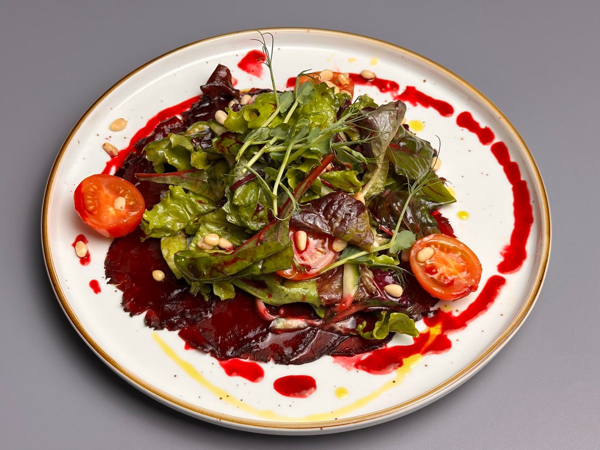 Микс салата с печеной свеклой, помидоры черри, огурец, кедровые орешки, фирменная заправка