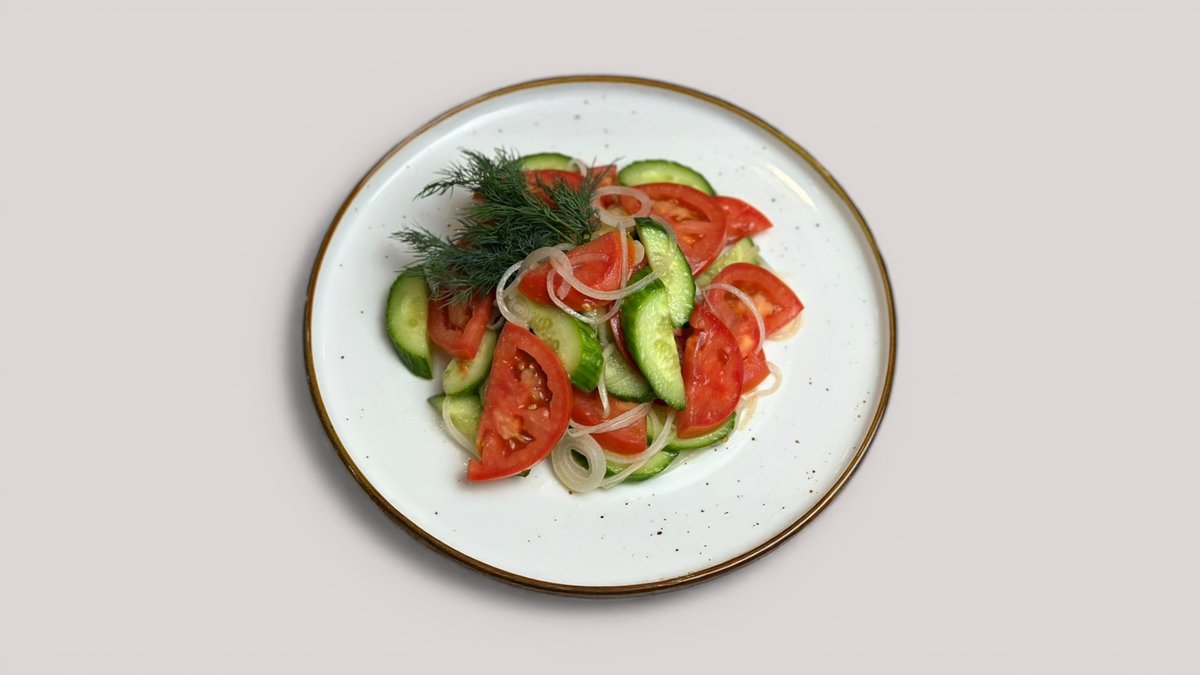 Свежие помидор, огурец, лук репчатый заправленные домашним маслицем