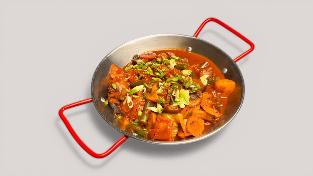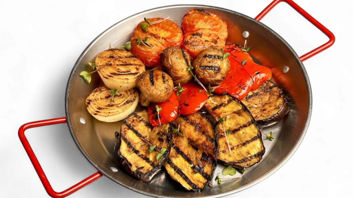 Томлённые овощи: помидор, перец болгарский, шампиньоны, баклажан, морковь, стручковая фасоль, лук
