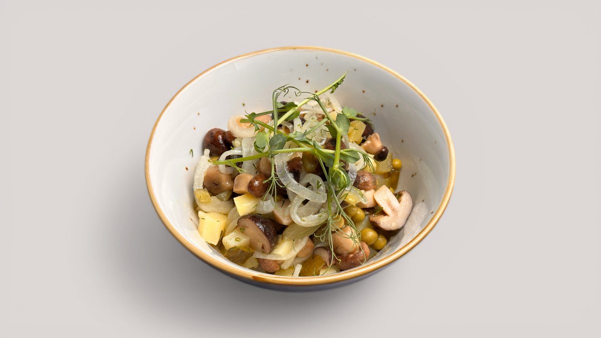 валуи с луком, зелены горошек, соленый огурец, отварной картофель, заправленные маслом