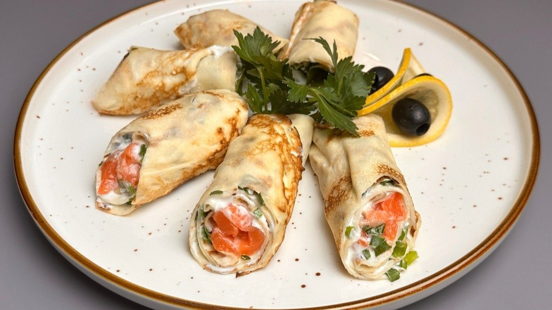 Блины с семгой слабосоленой, зеленым луком и сливочным сыром