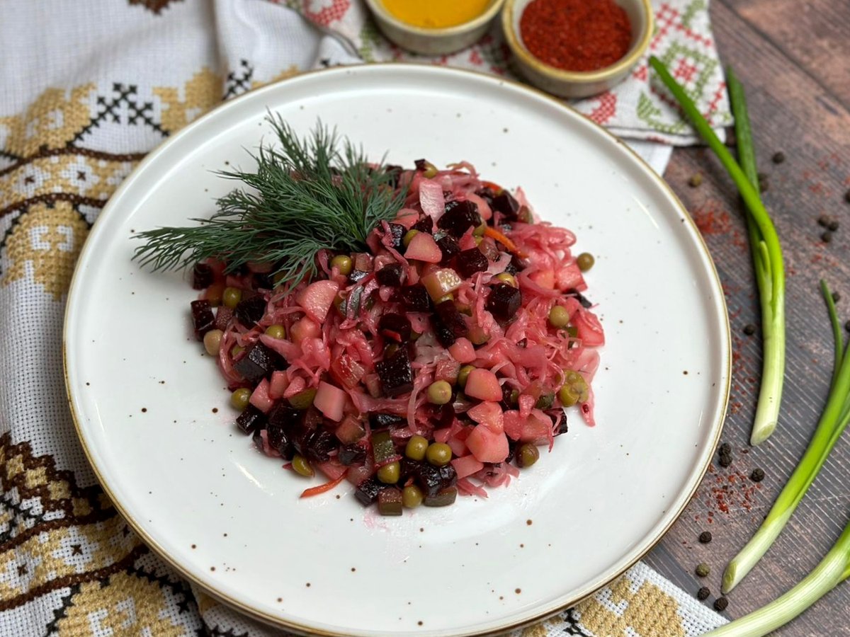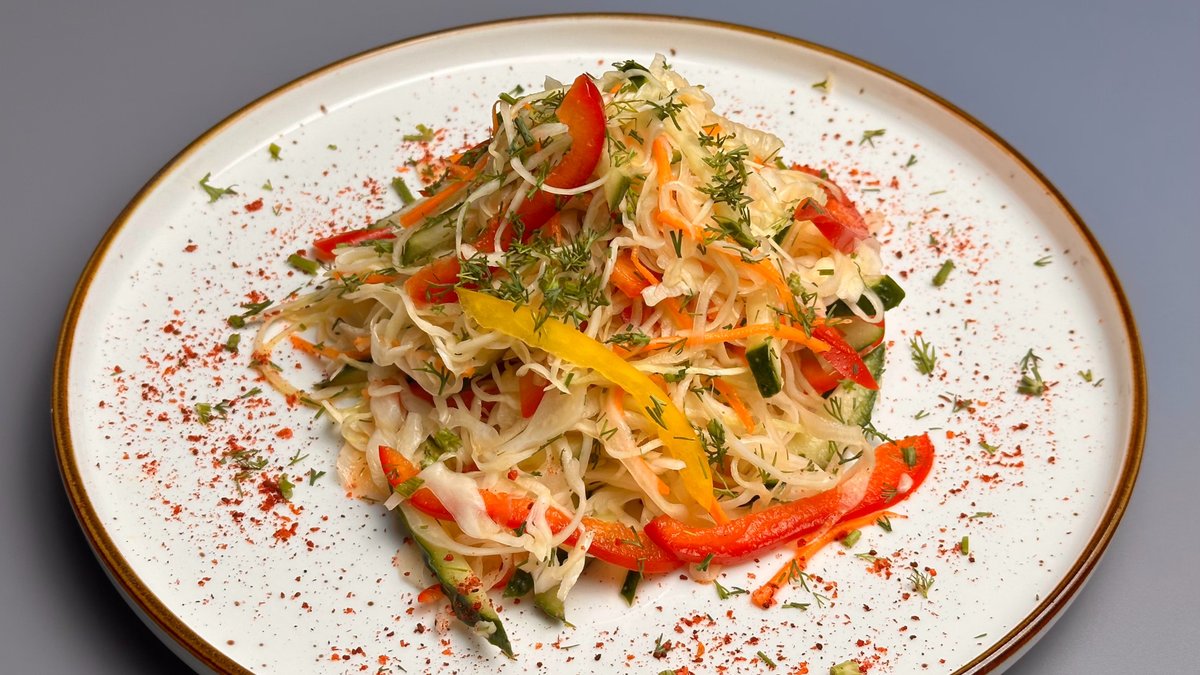 Свежая капуста, огурец, помидор, морковь, сладкий перец, заправка