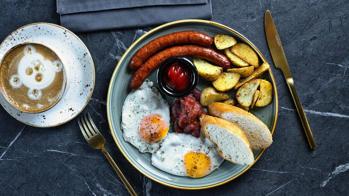 Сытный завтрак с яичницей-глазуньей из свежих яиц, румяными охотничьими колбасками и хрустящими ломтиками картофеля. Дополнен тушеной фасолью в томатном соусе для насыщенного вкуса. Идеальное начало дня для тех, кто ценит простой и вкусный завтрак в деревенском стиле.