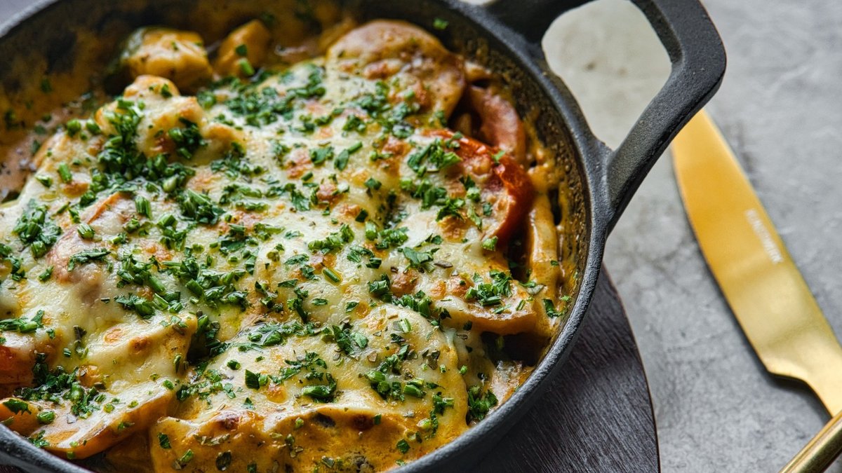 Запеченное куриное филе в нежном сливочном соусе с ароматными шампиньонами и картофелем.