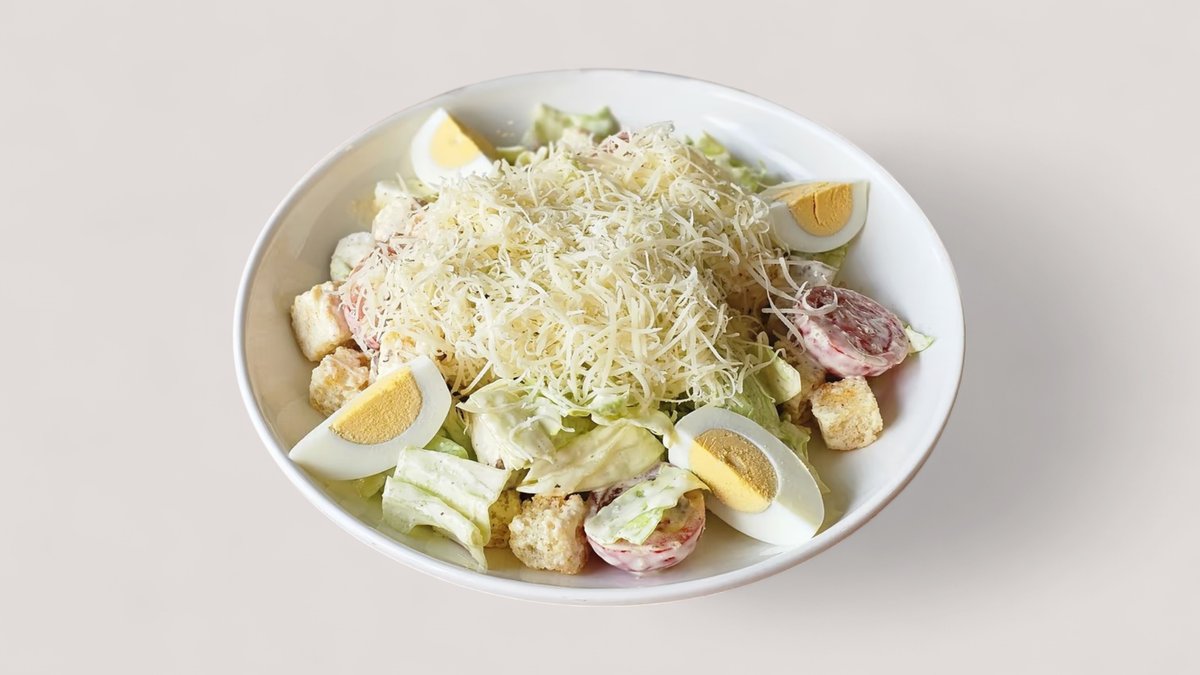 айсберг, креветки, яйца, помидоры черри, крутоны, соус цезаро, пармезан.