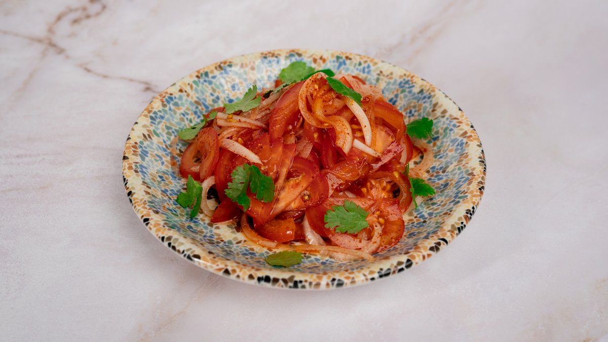 Классический салат из помидор и лука, который идеально подойдет к горячим блюдам восточной кухни и блюдам из мяса.