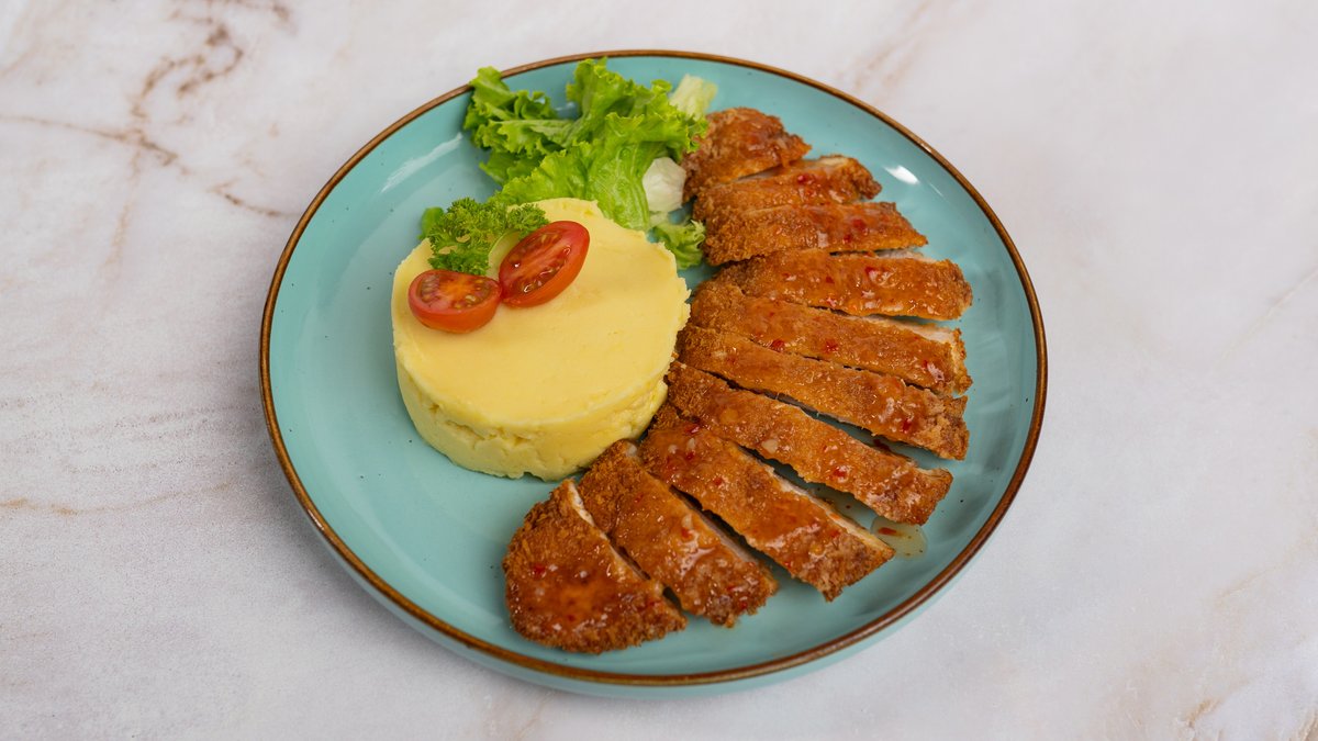 Куриное филе, лист салата, сыр "Чеддер", огурец, помидор, крафтовая булка, майонез, кетчуп, фри, горчичный соус.