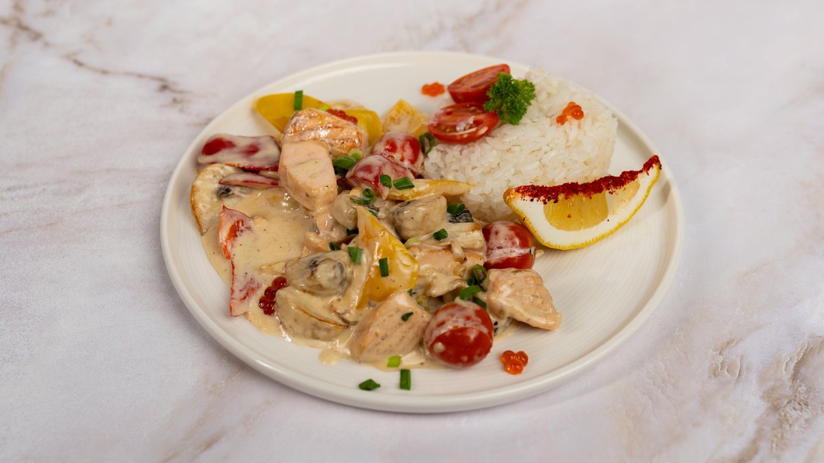 Филе куриное, сливки, грибы, лук, чеснок, рис, томаты черри.