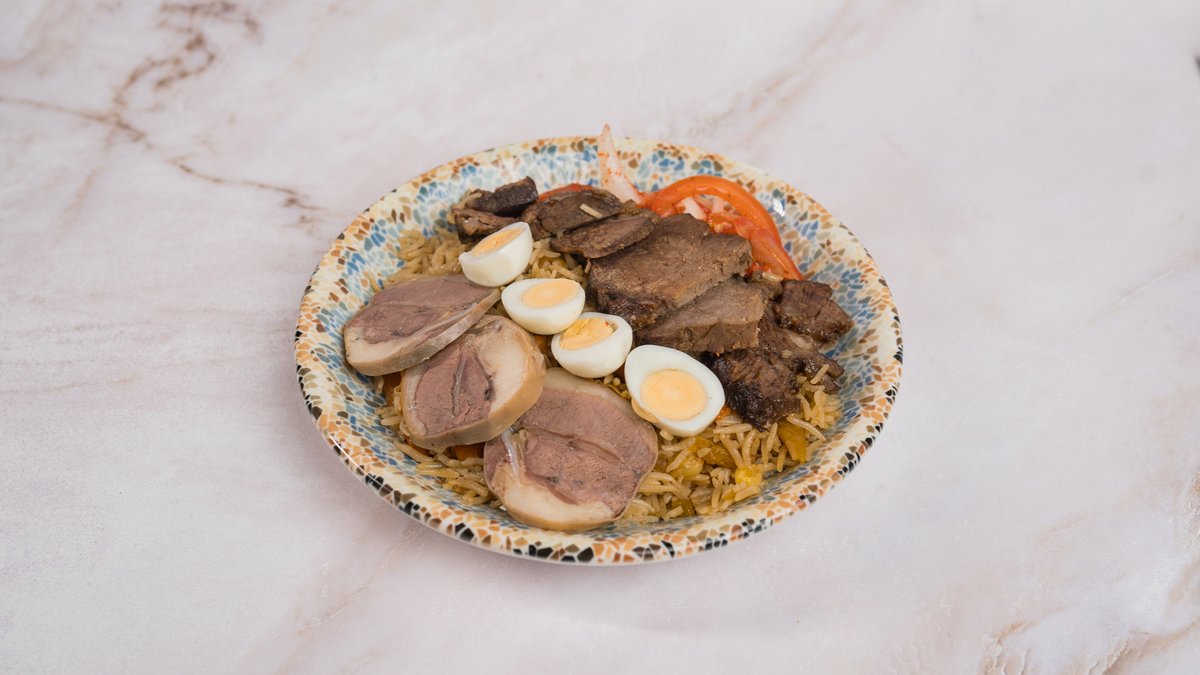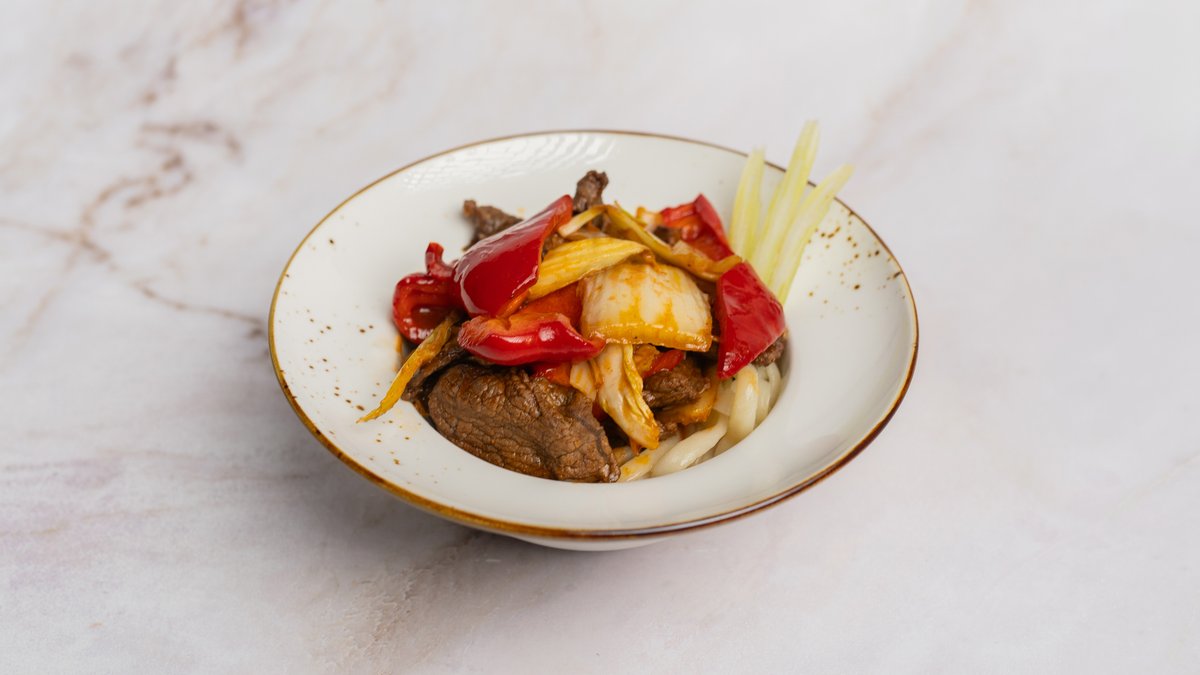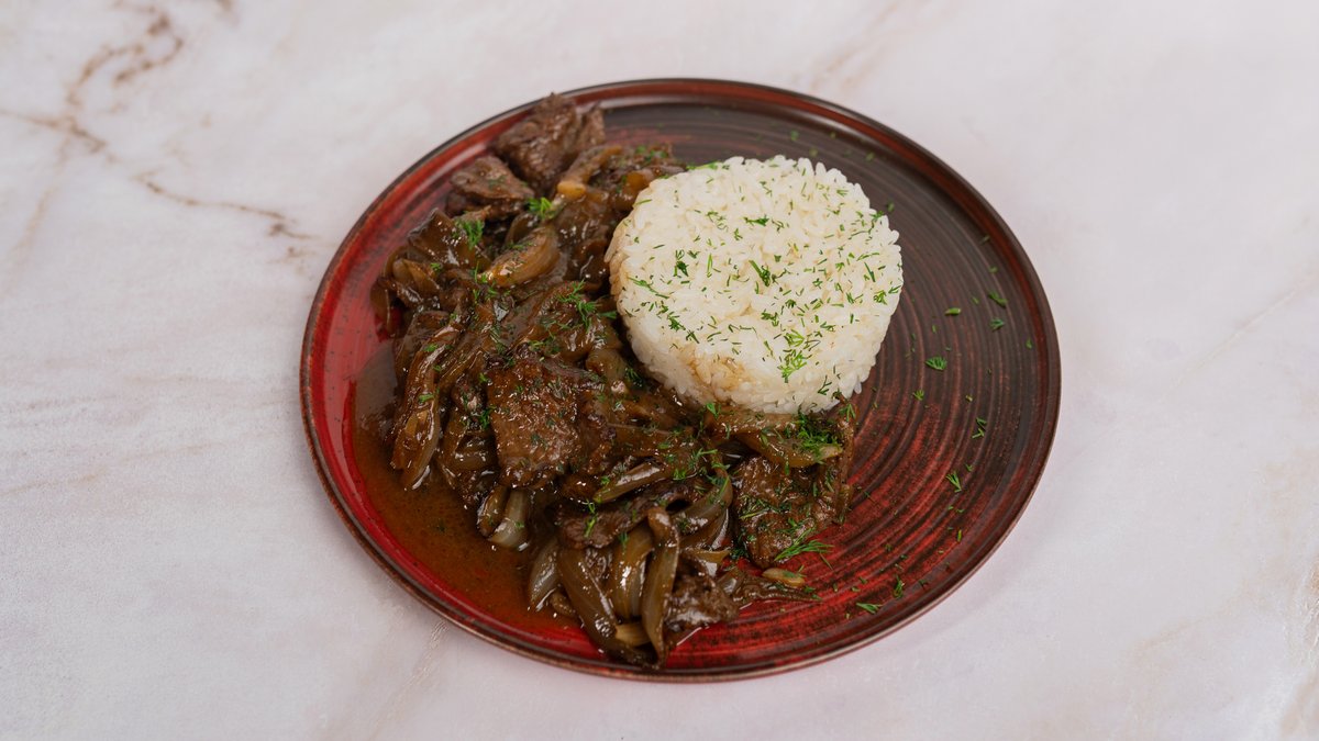 Мякоть телятины маринованная, лук, соевый соус, рис.