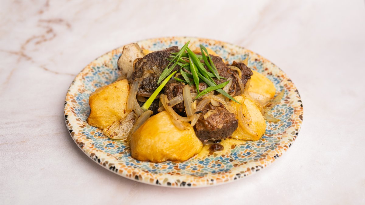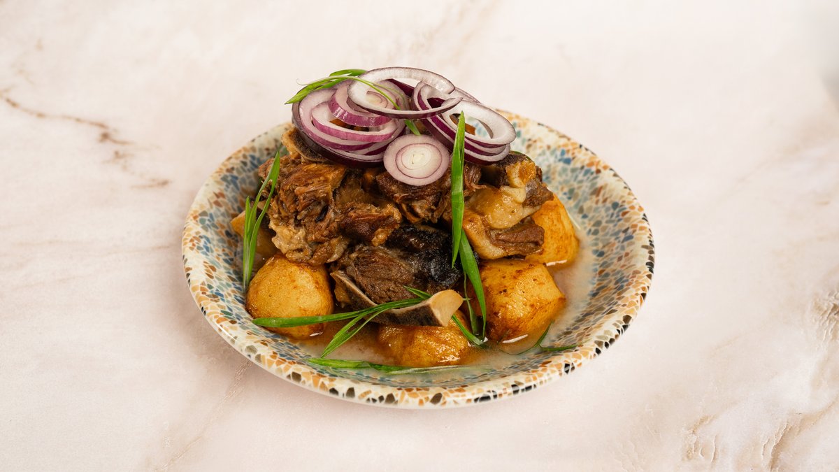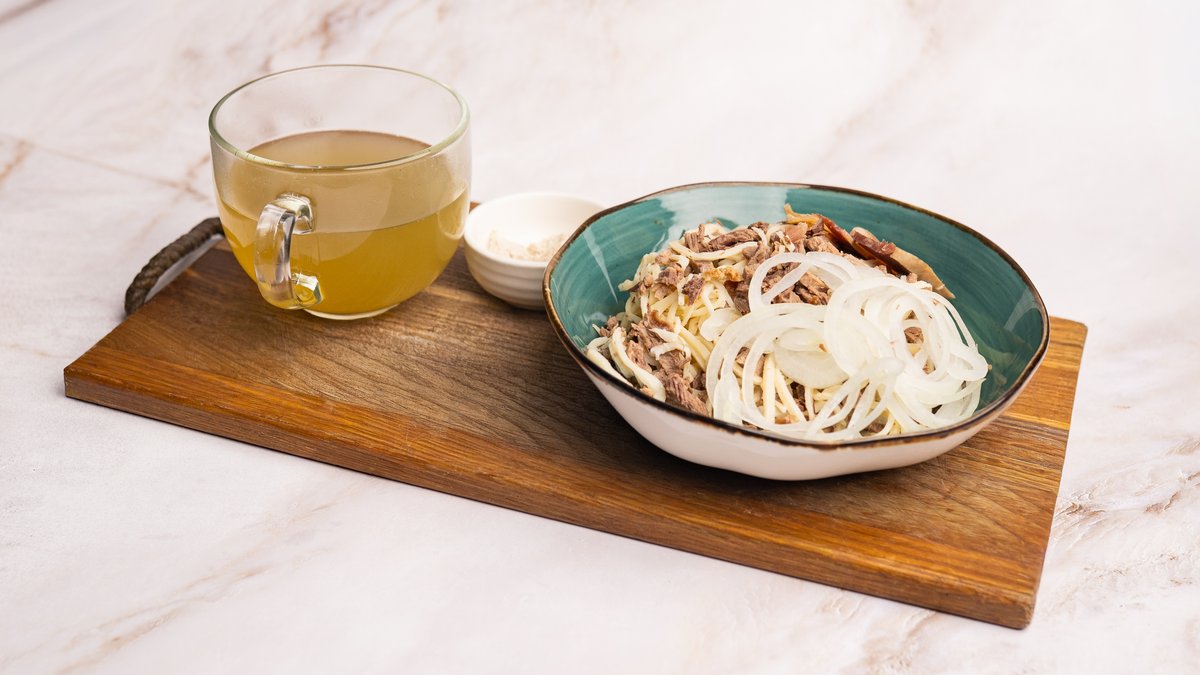 Галушки чеченские, отварная говядина, бульон, картофельно-чесночный соус.