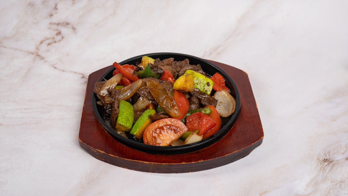 Телятина, болгарский перец, баклажан, черри, лист салата.