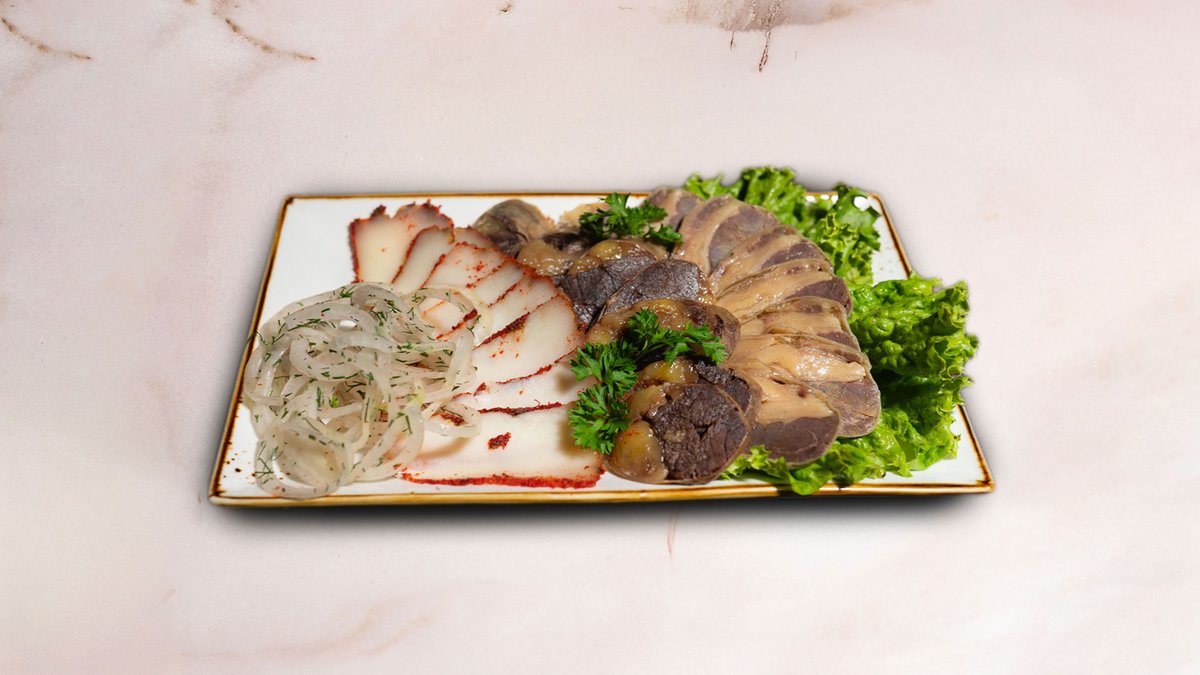 Салат из трех видов мяса с каперсовой заправкой.