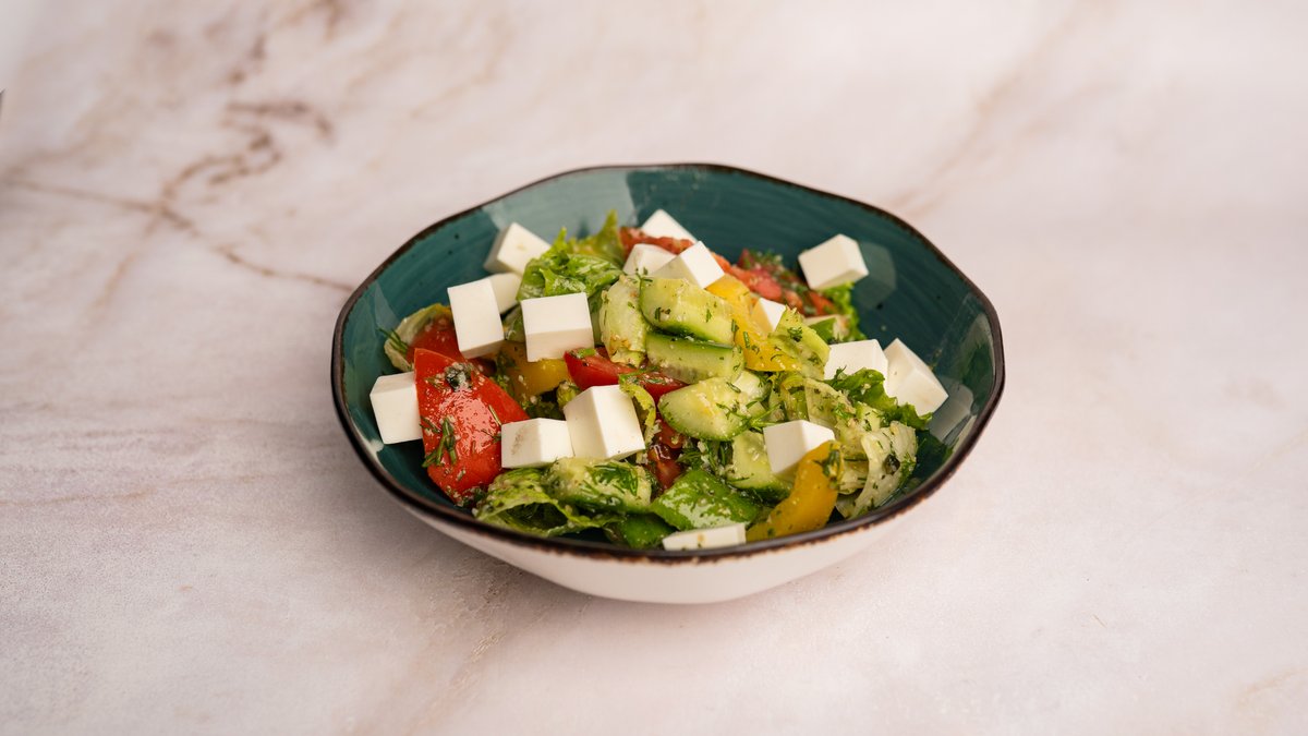 Фермерский салат - это классика. Свежие томаты и огурцы с традиционной заправкой.