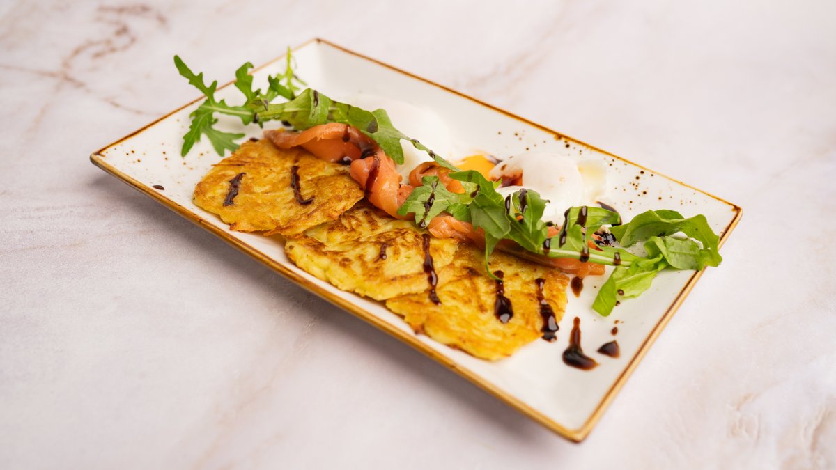 Дранники с семгой и яйцом пашот