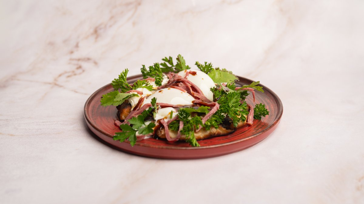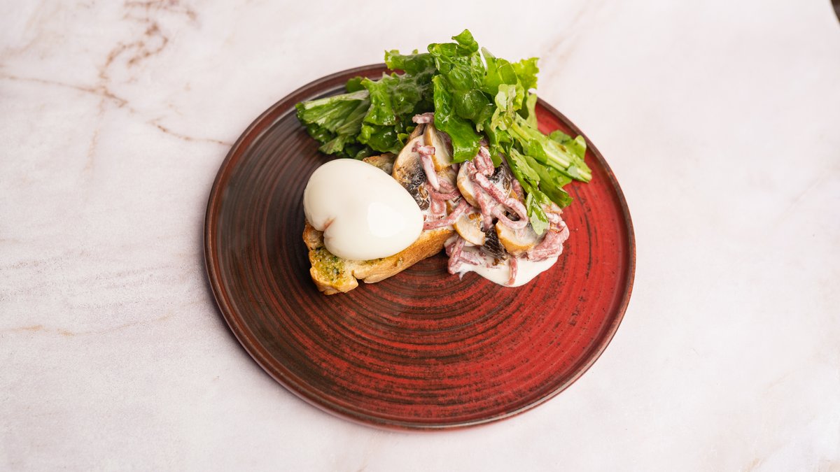 Тост из чиабатты с яйцом пашот, грибами и копченой говядиной.