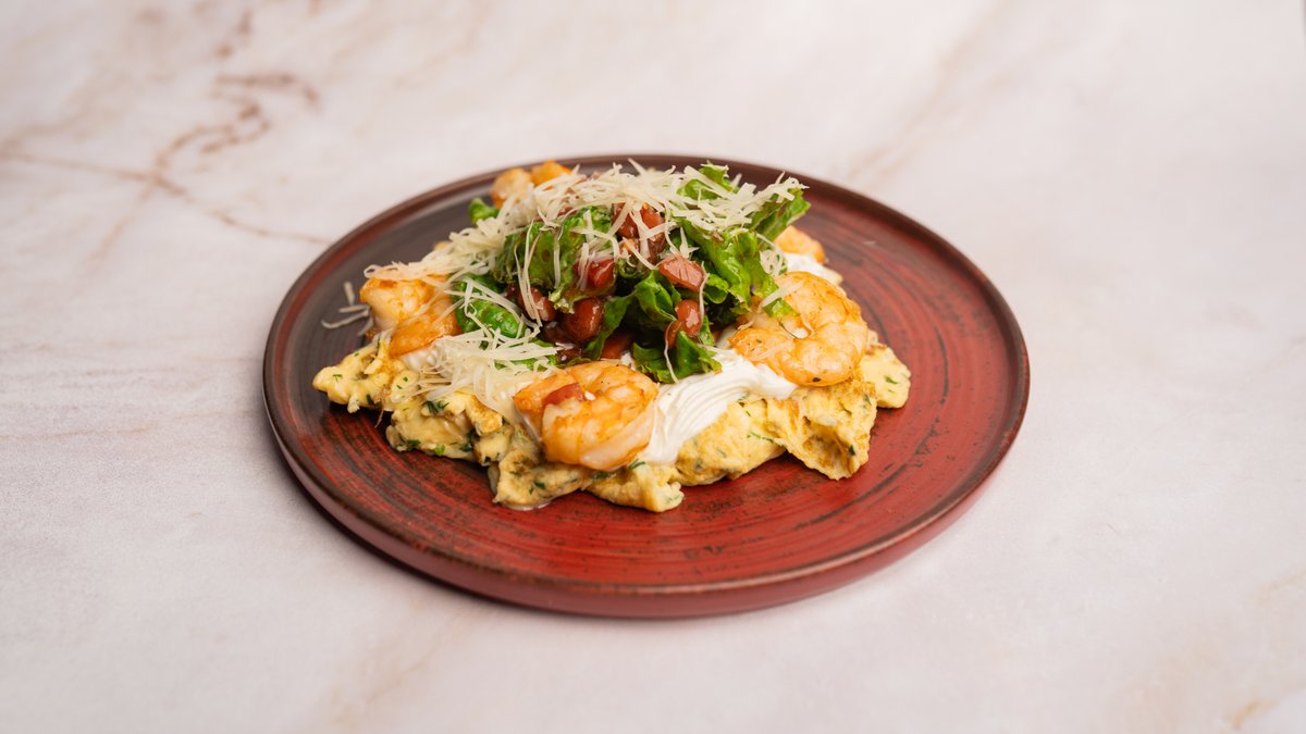 Омлет с тигровыми креветками, гранатовым соусом и помидорами конкассе.