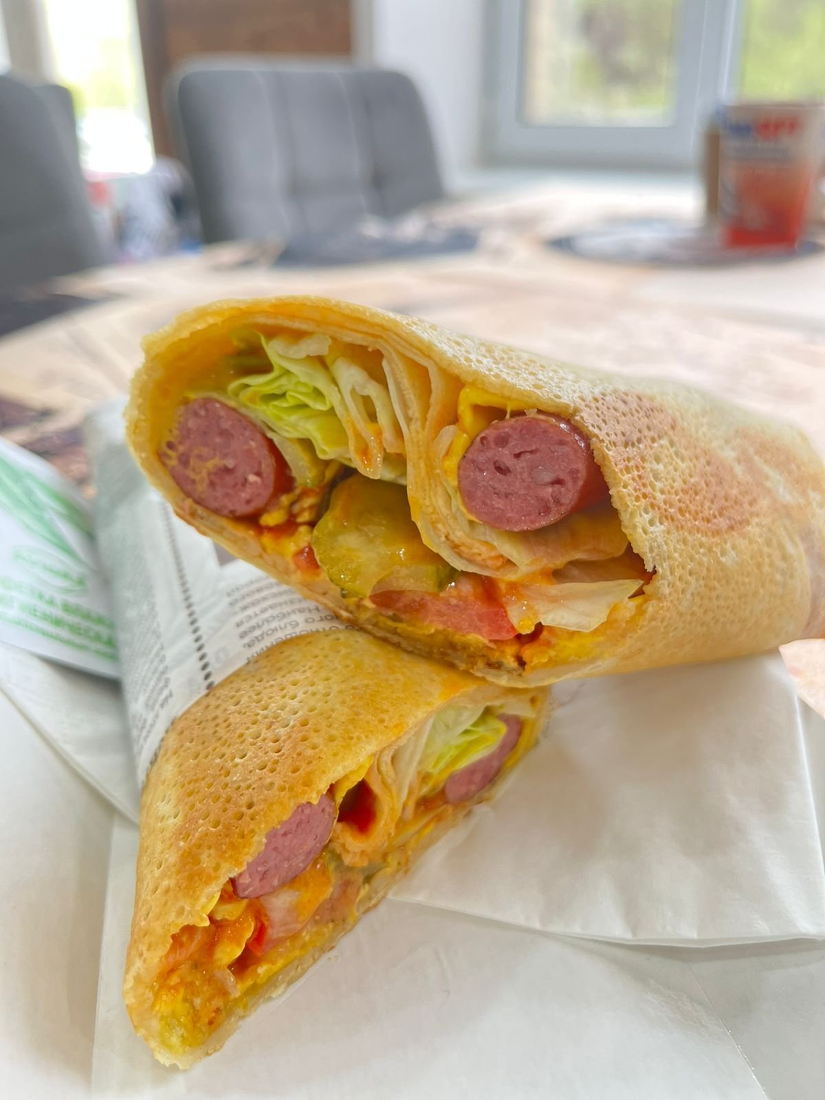 охотничьи колбаски, салат Айсберг, сыр Чеддер, соленый огурец, помидор, кетчуп, горчица