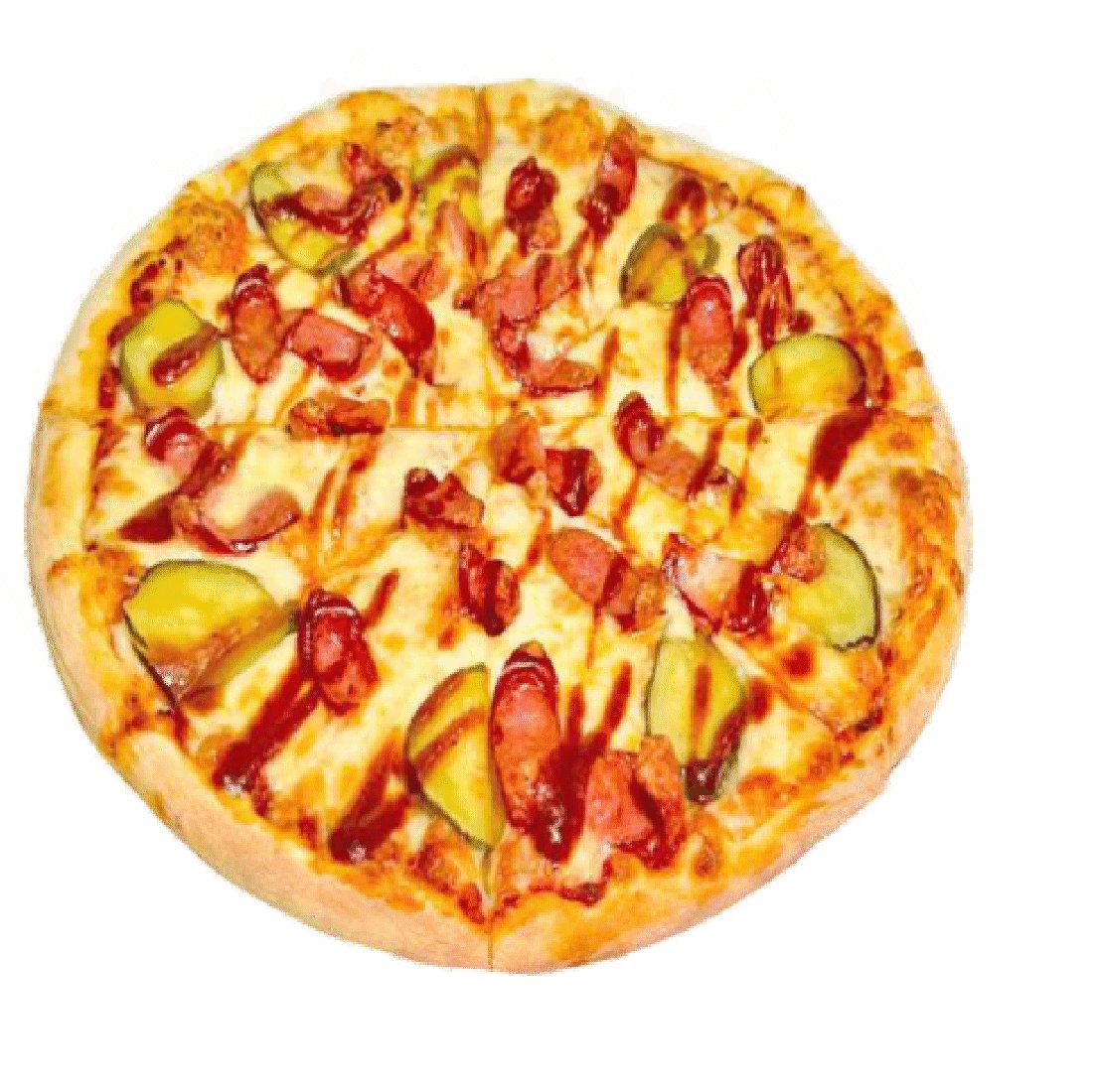 Томатный соус, сыр моцарелла, колбаски охотничие, огурцы солёные, соус BBQ