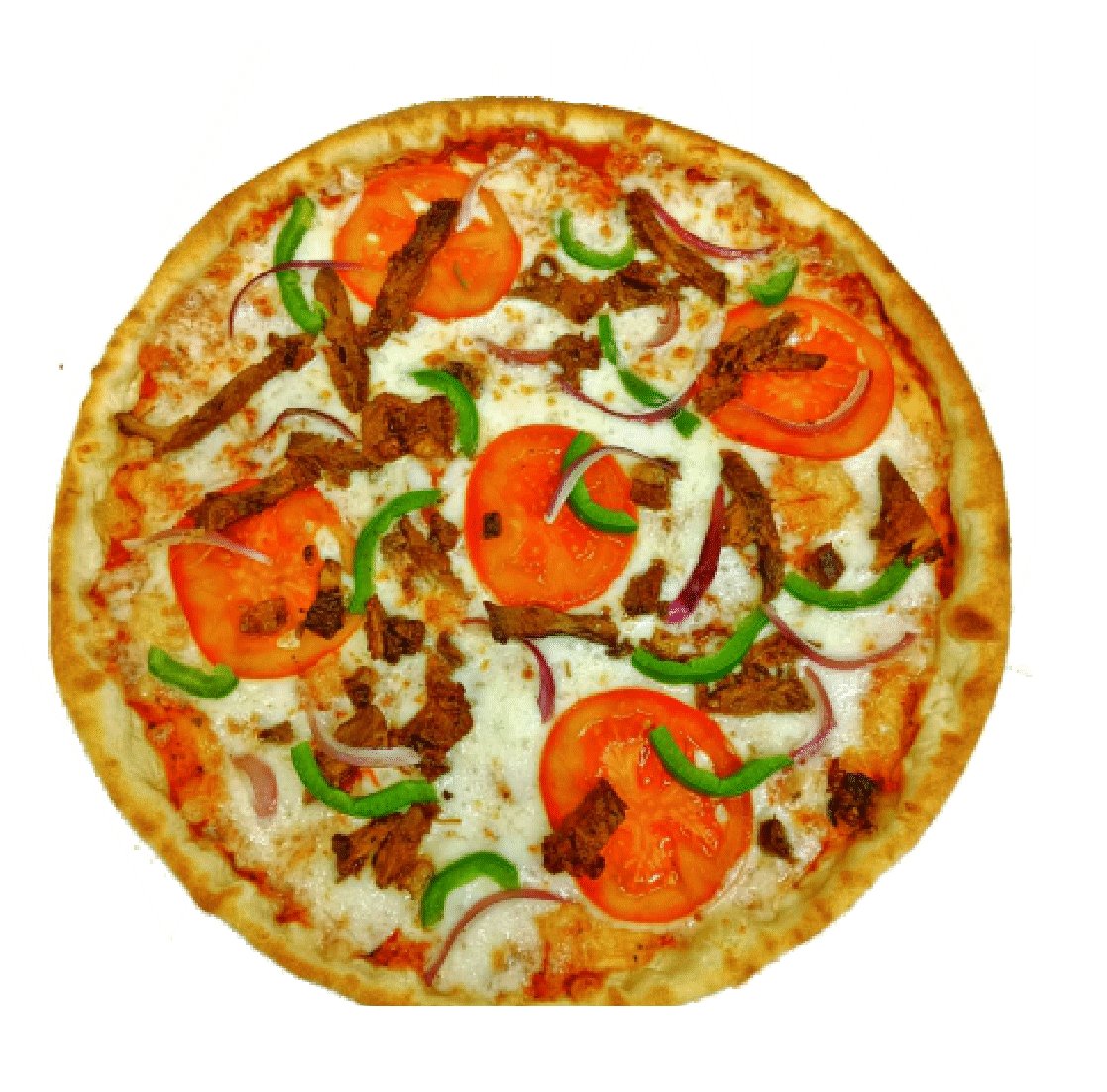 Сочный запеченный кебаб из говядины, красный лук, сладкий перец, томаты, сыр моцарелла, фирменный томатный соус, тонкое тесто.