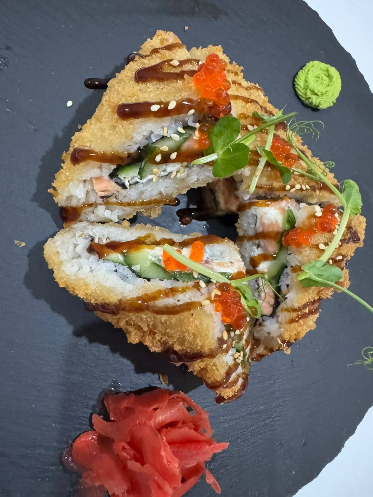 Копченая куриная грудка, рис, нори, томаго, панко, сыр филадельфия, огурец