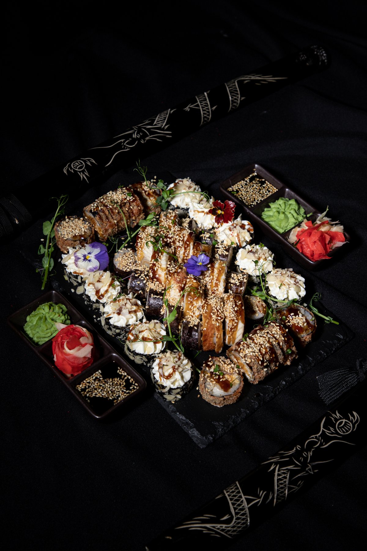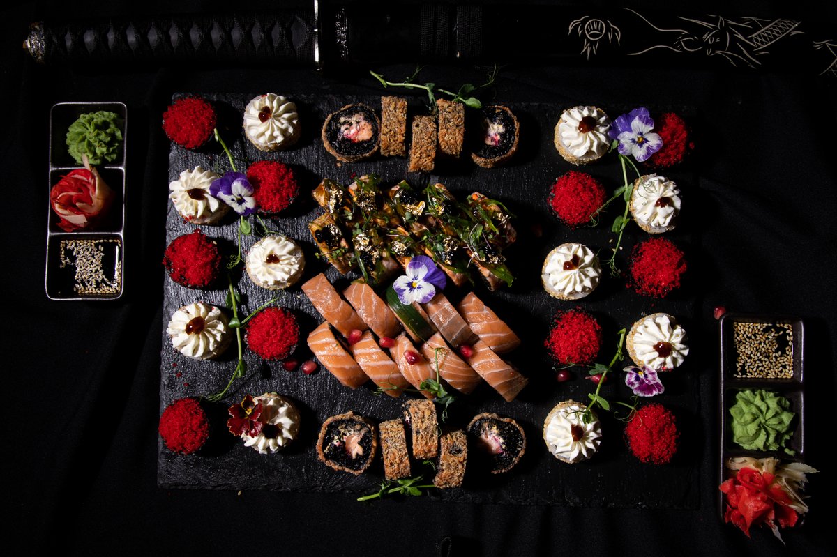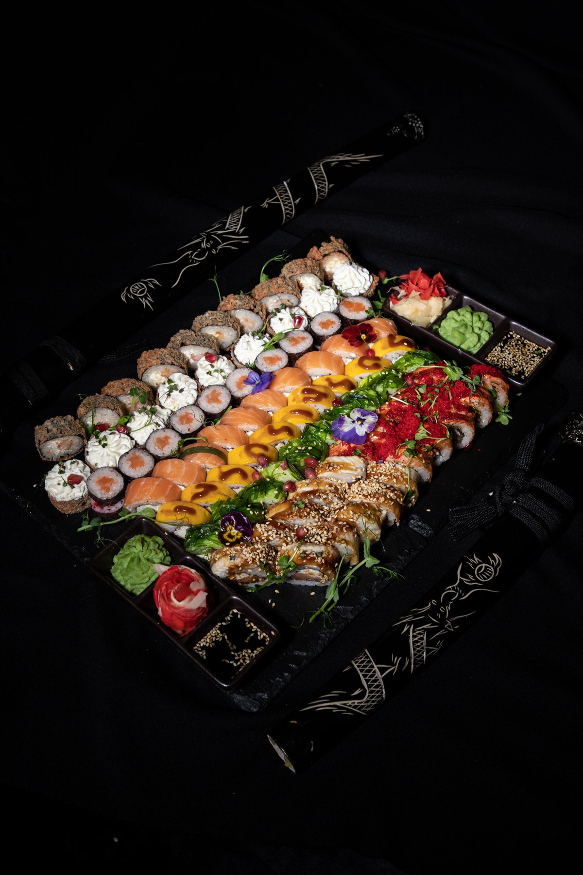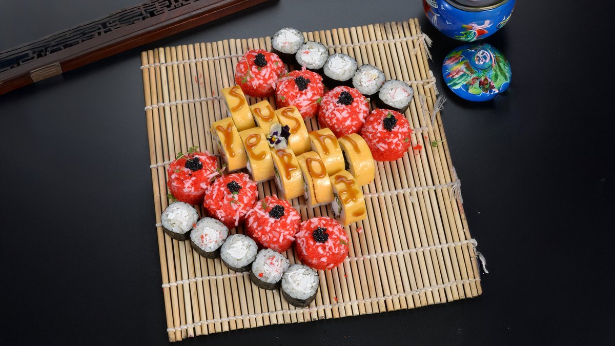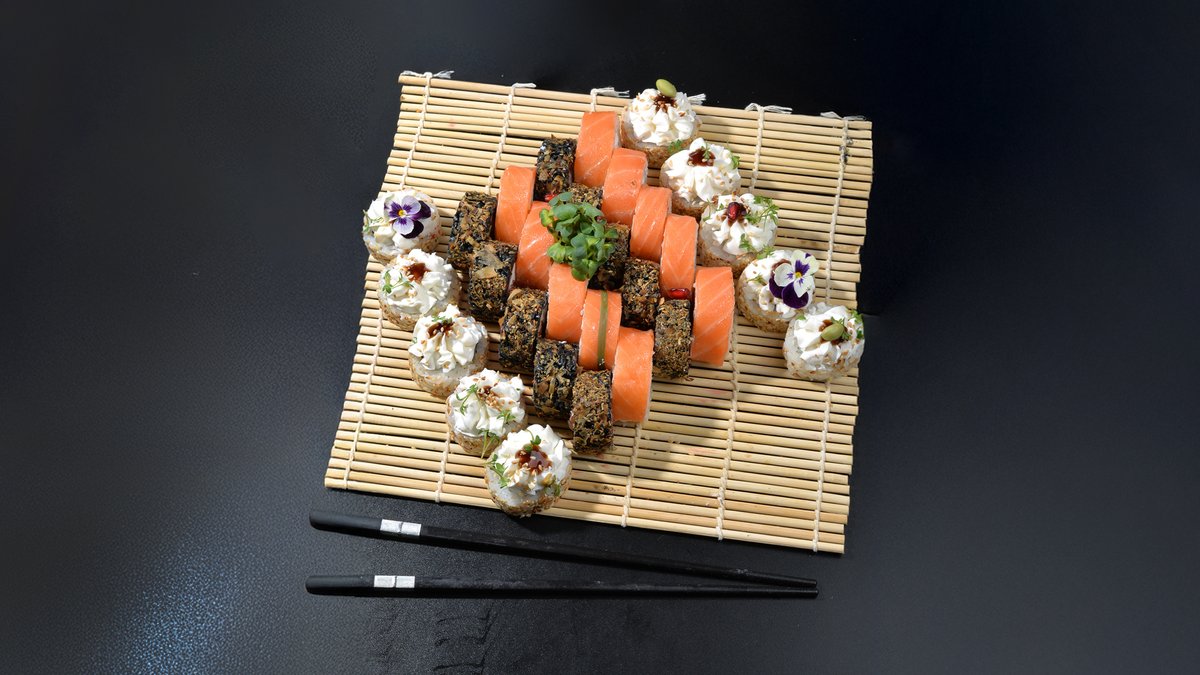 Сыр филадельфия, свежий лосось, копченый угорь, микс икры летучей рыбы и зернистой икры, соус унаги и соус спайси, хрустящая понировка, микрозелень.