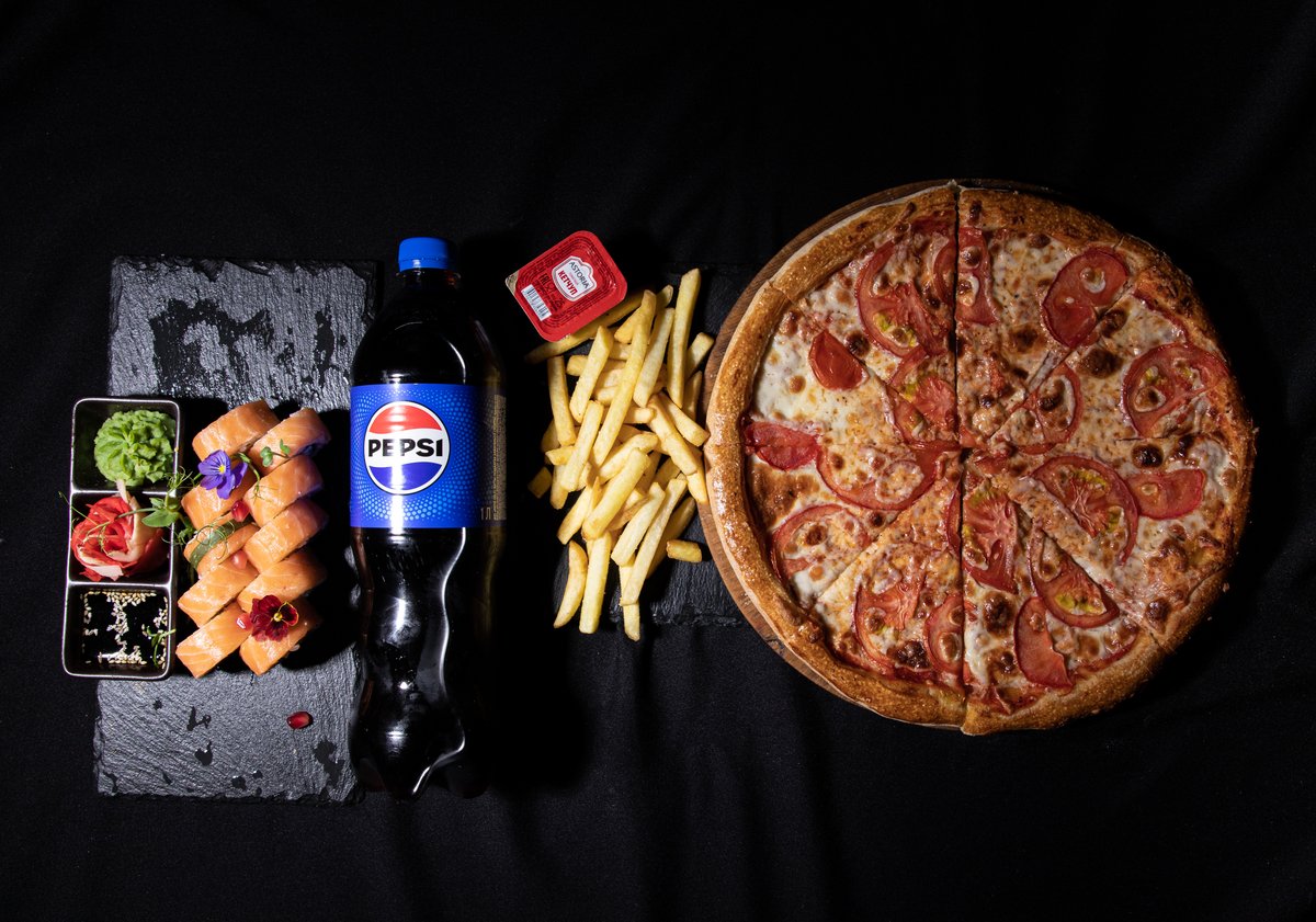 Филадельфия, картофель фри, пицца Маргарита, пепси 1л