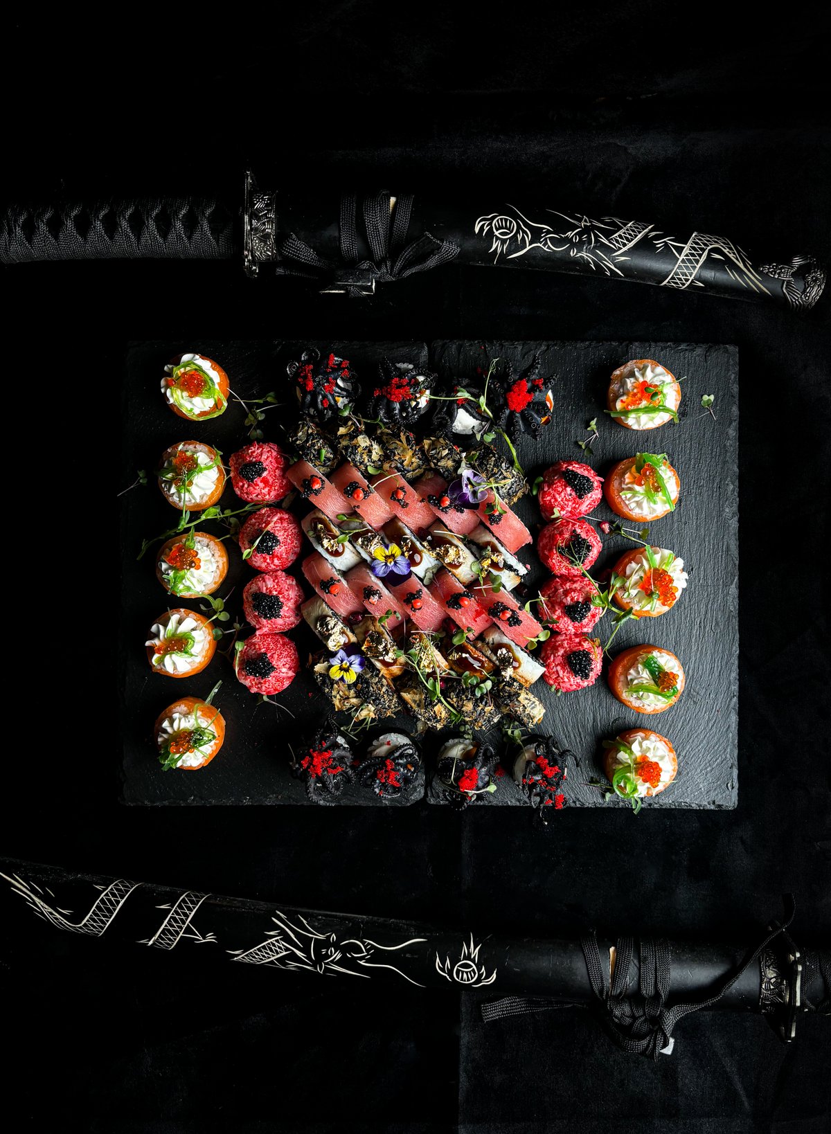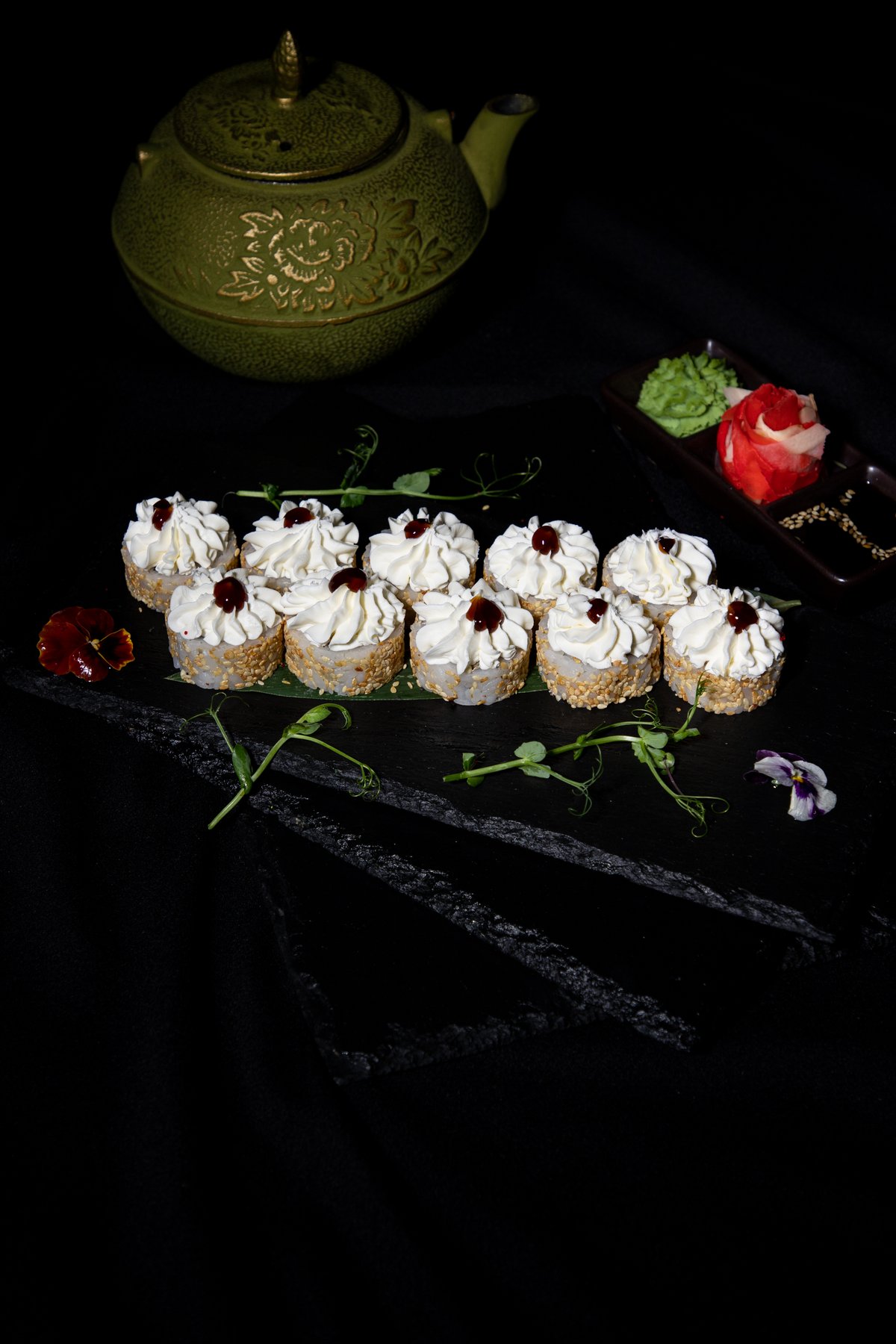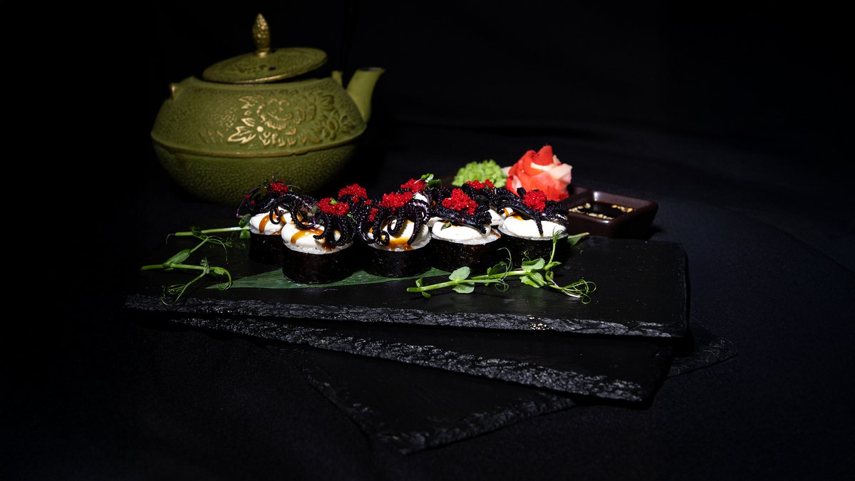 творожный сыр, тунец, спелая медовая груша, осьминожки, кунжутное масло, соус Унаги, икра летучей рыбы, микрозелень
