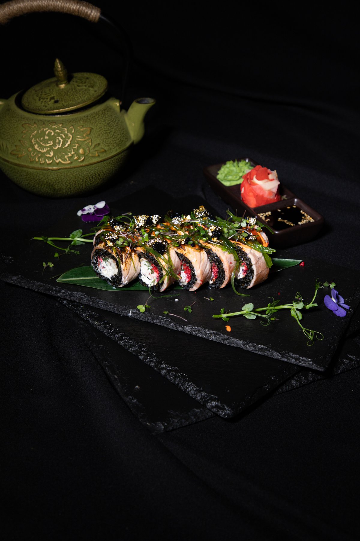 Сыр творожный, лосось оппаленый, свежий огурец, Тобика, спайси соус, унаги соус, зернистая икра, микрозелень, сусальное золото.
