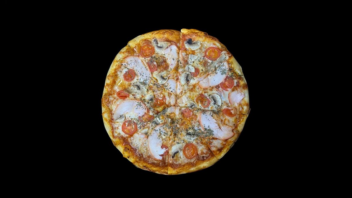 Копченая куриная грудка, соус томатный, орегано, сыр моцарелла, черри, шампиньоны, унаги соус.