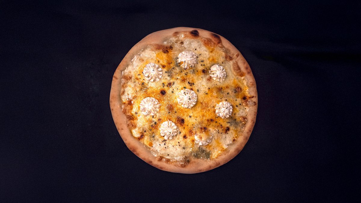 Нежный сливочный соус, сыр моцарелла,гауда, дор блю, пармезан, орегано.