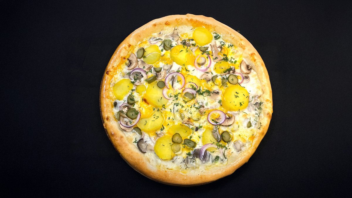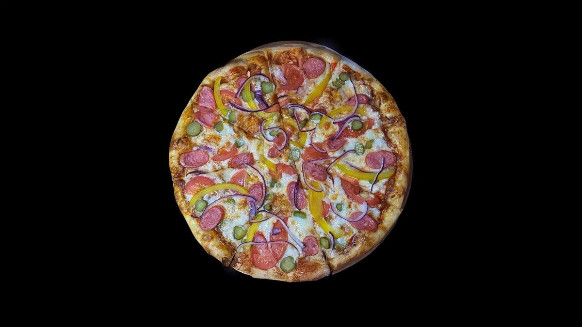 Нежный сливочный соус, охотничьи колбаски, корнишоны, лук шалот, сыр моцарелла, бальзамический крем, орегано.