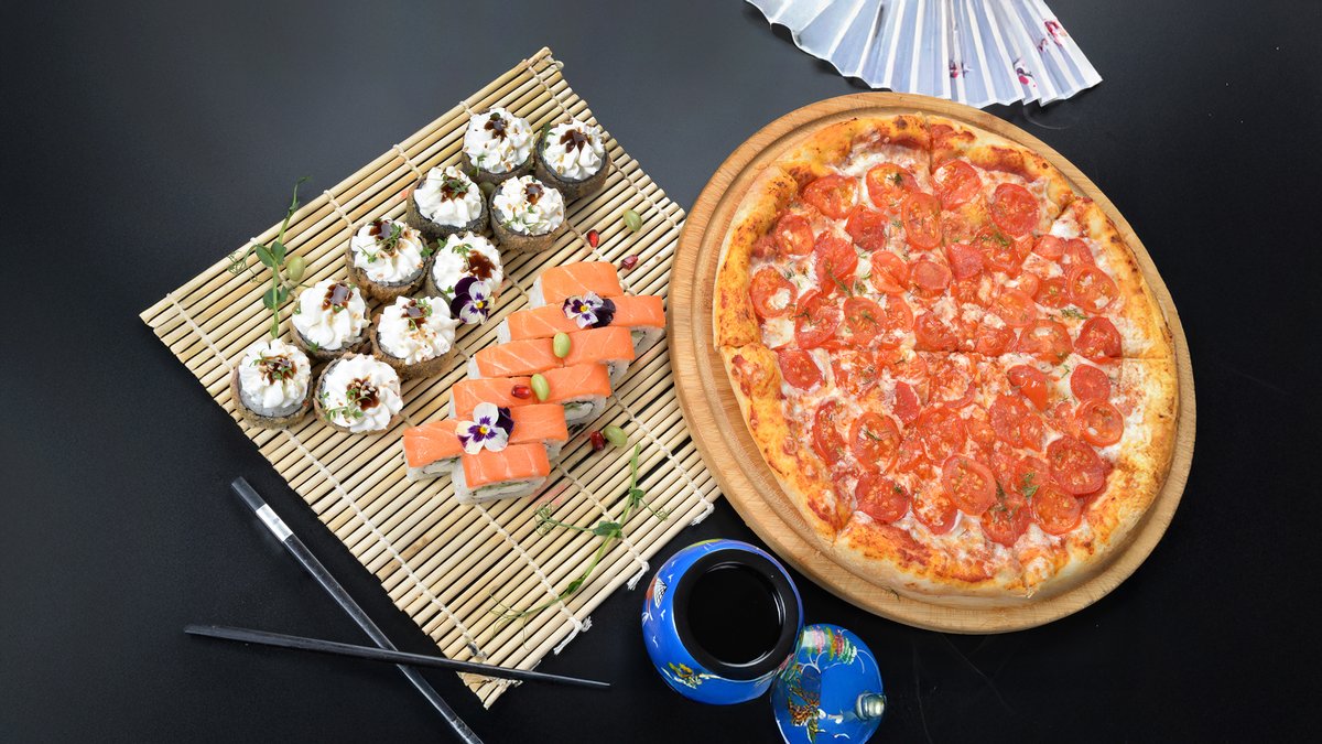 Пицца маргатира 30см, филадельфия лайт 10шт, чикен темпура 10шт