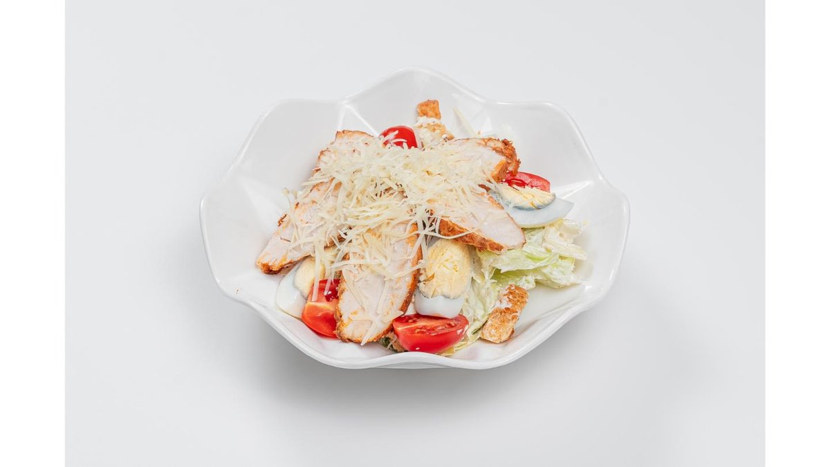 Chicken fillet, lettuce, cherry tomatoes, croutons, eggs, tomato, Parmesan cheese, Caesar sauce