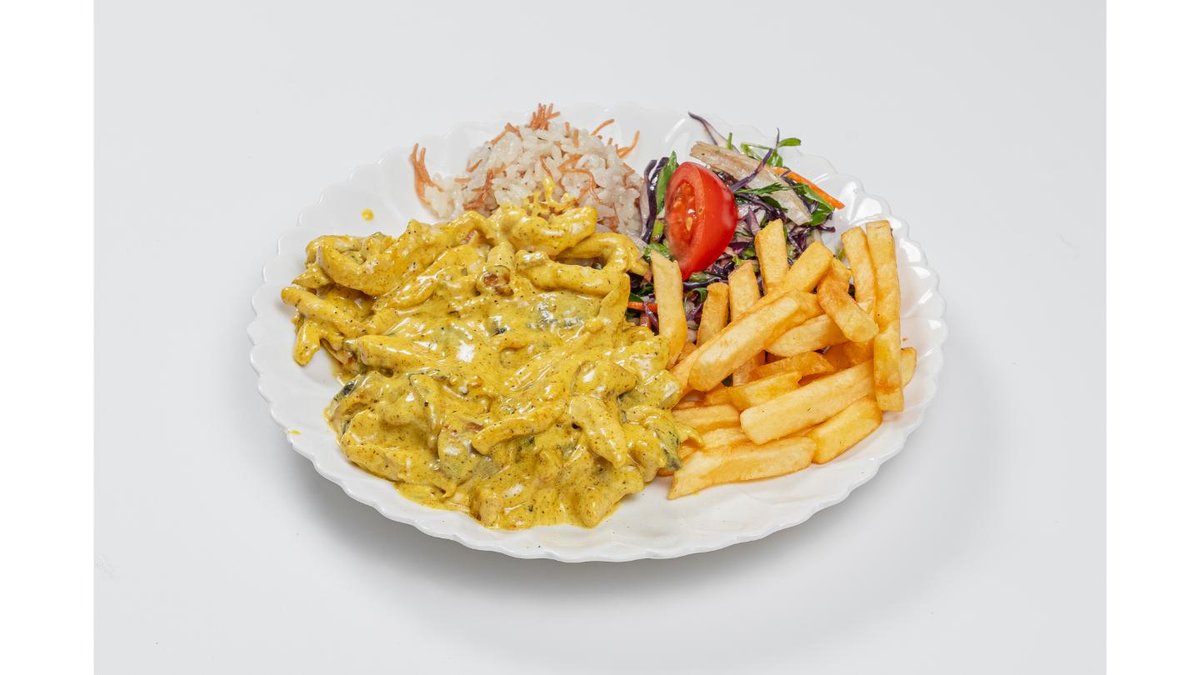 Chicken fillet, mixed greens, rice and french fries, mushrooms, curry seasoning