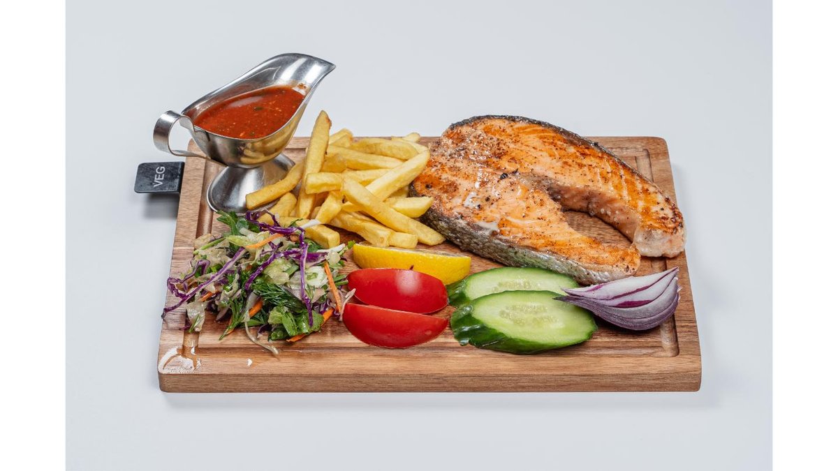 Salmon fillet, mixed greens, rice, french fries, mushrooms, sweet chili sauce