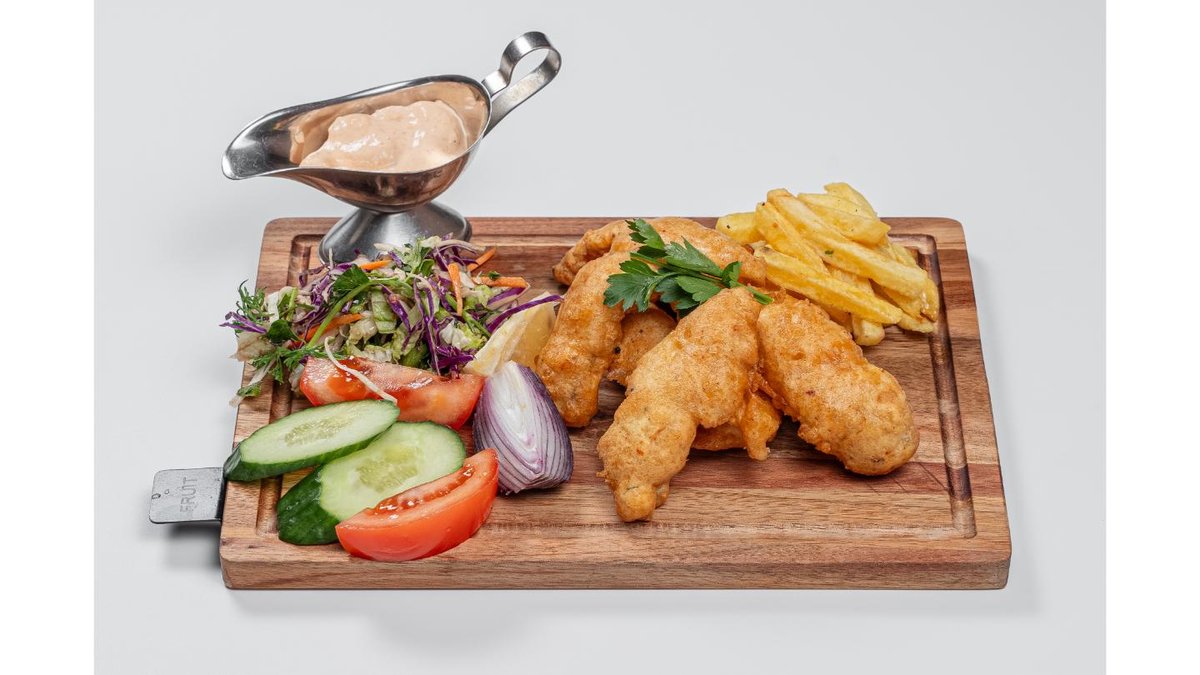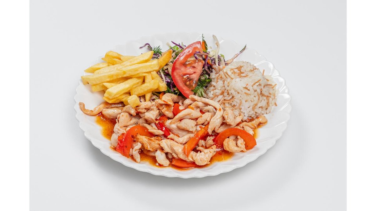 Chicken fillet, pancake, bell pepper, mozzarella cheese, tomato, soy sauce, mixed salad, french fries