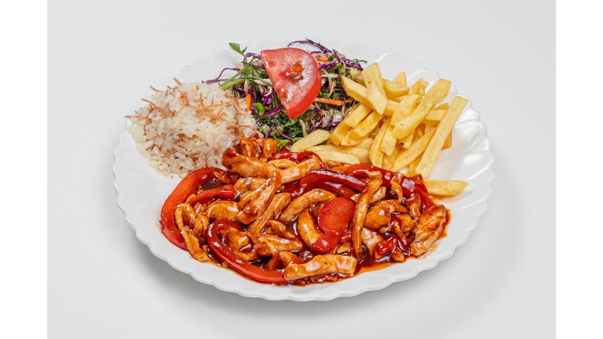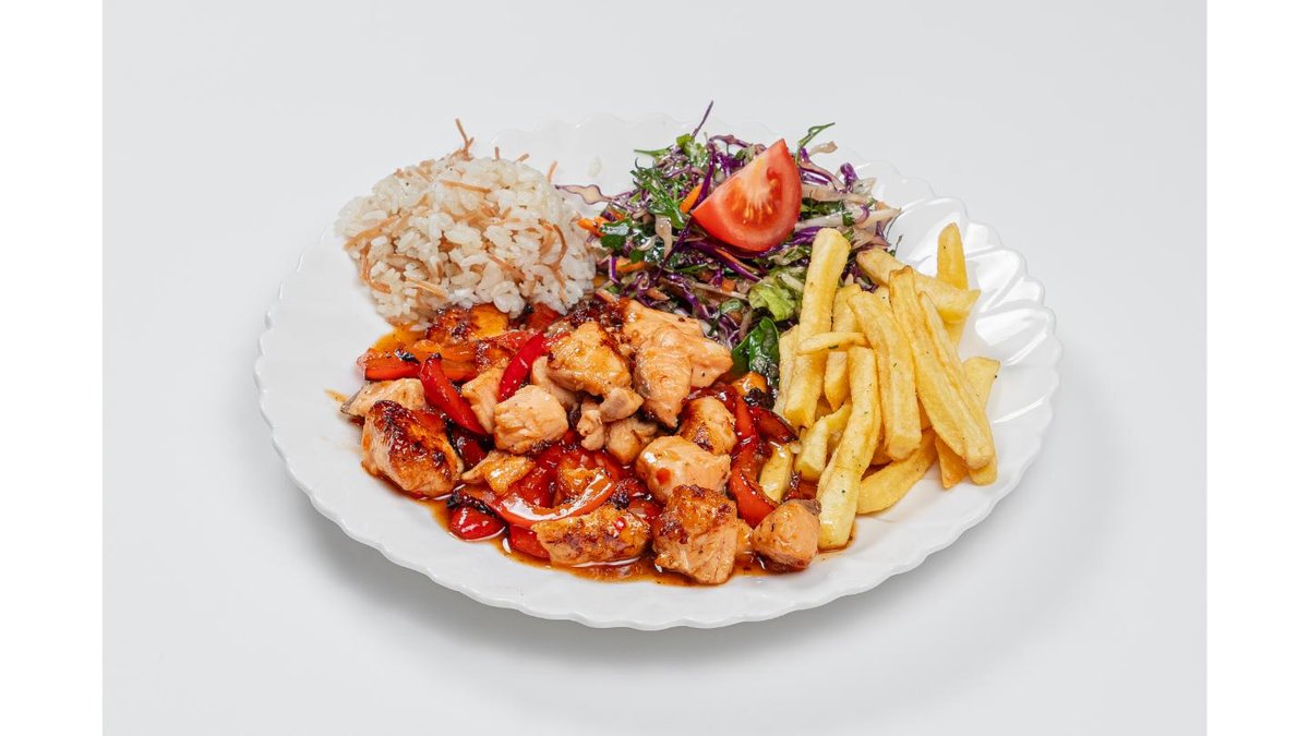 Chicken fillet, mixed greens, rice and french fries, mushrooms, BBQ sauce
