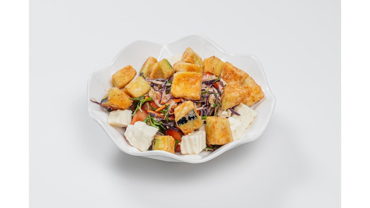 Mixed greens, fried eggplant, feta cheese, tomato, red cabbage