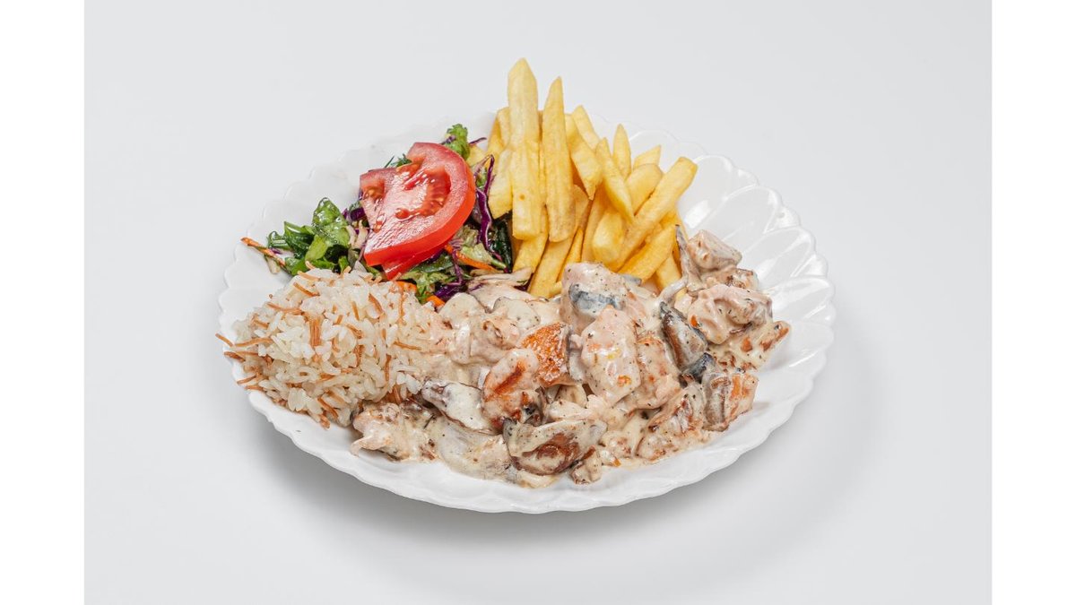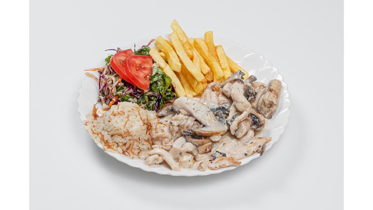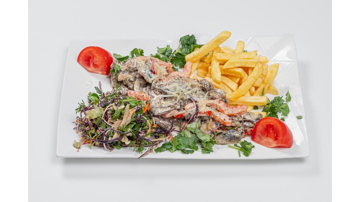 Chicken fillet, mixed greens, french fries, mushrooms, cream