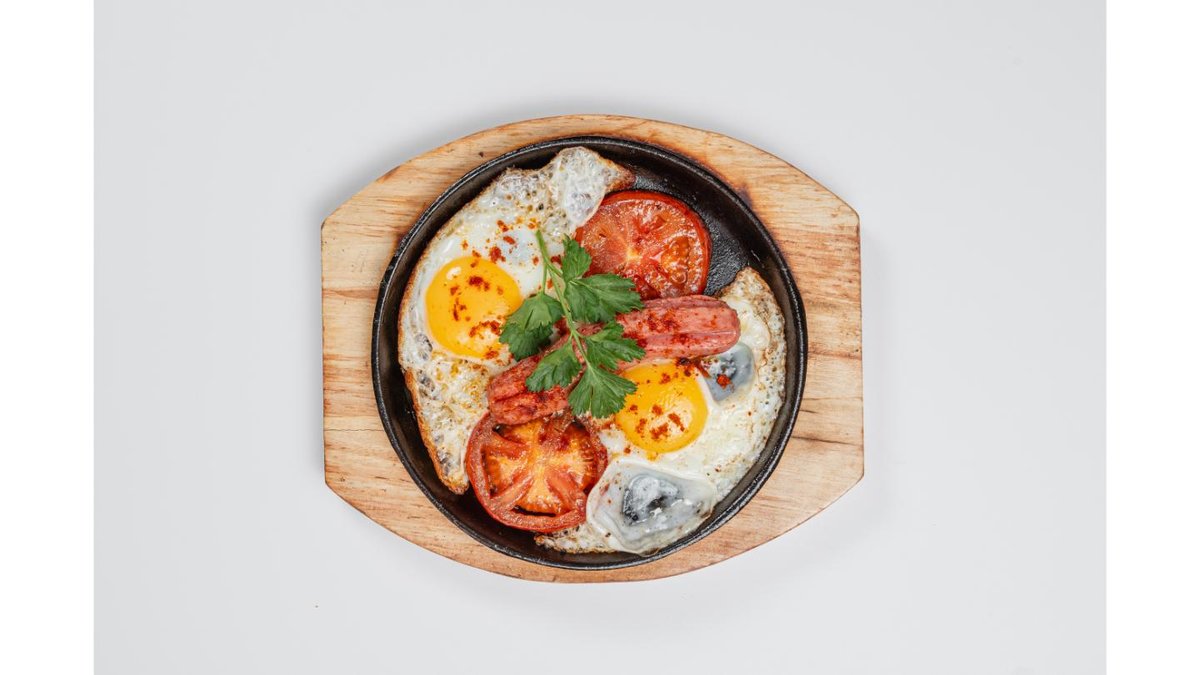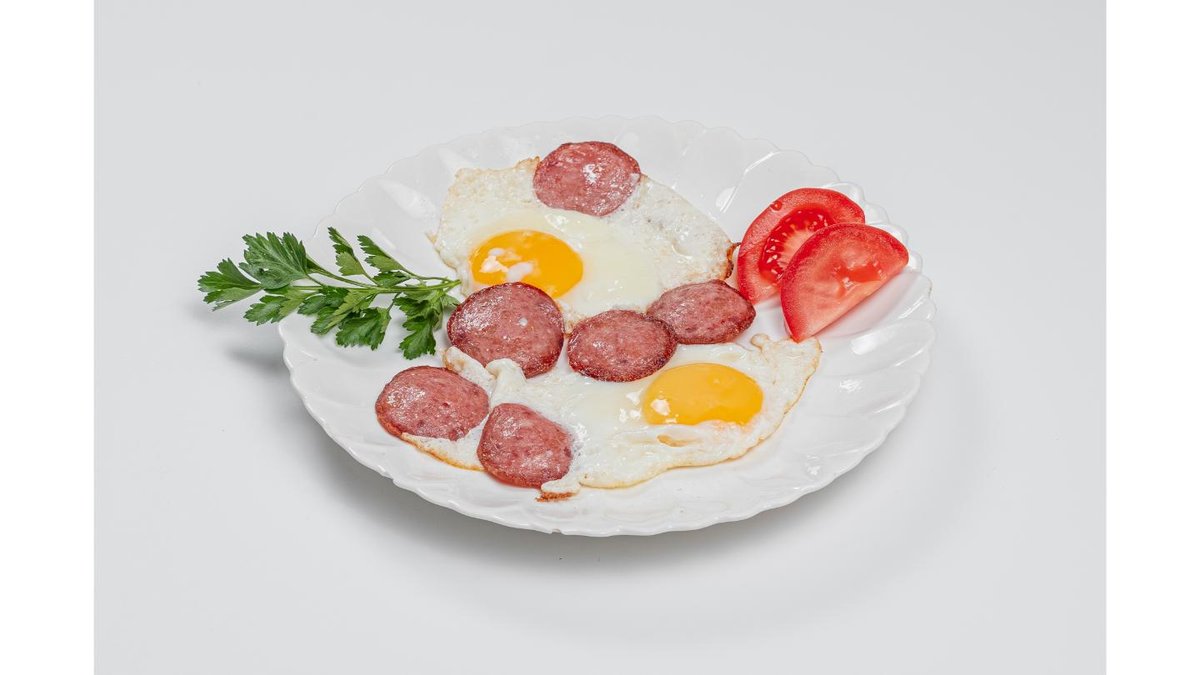 Eggs, fried sausage, tomato