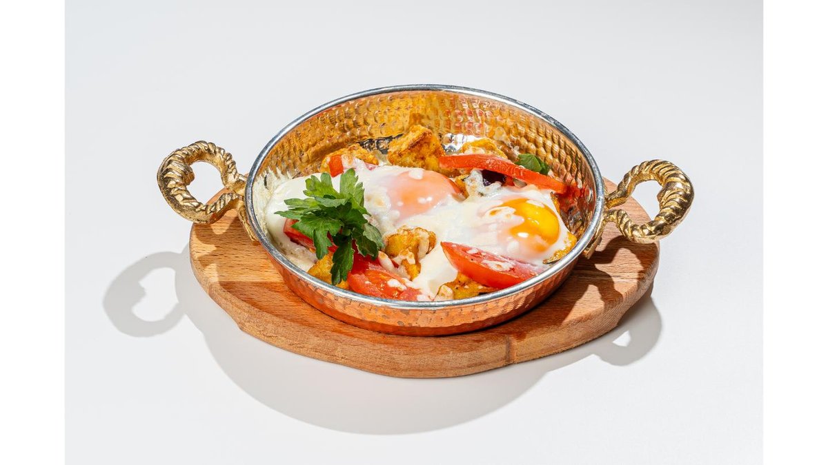 Eggs, fried eggplant, bell pepper, tomato