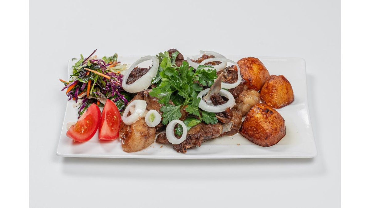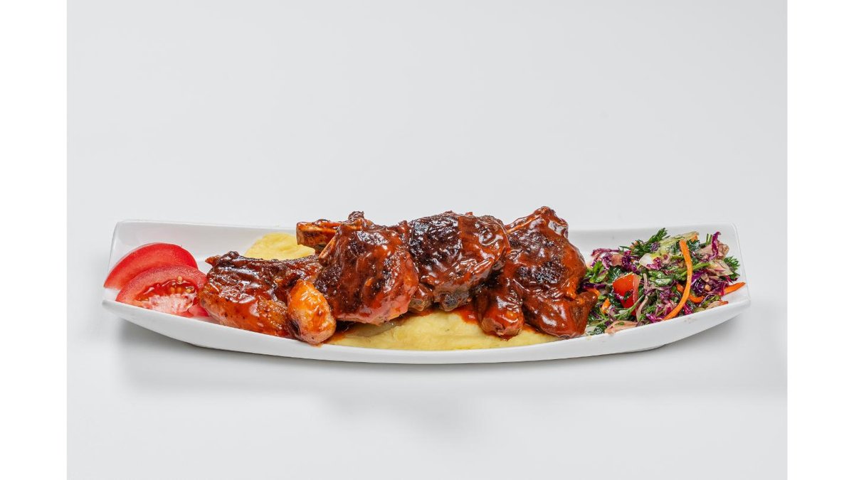 Lamb with spicy sauce, mashed potatoes, mixed salad