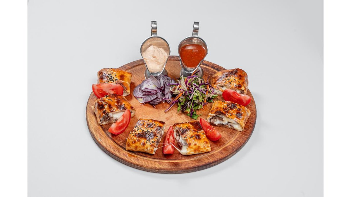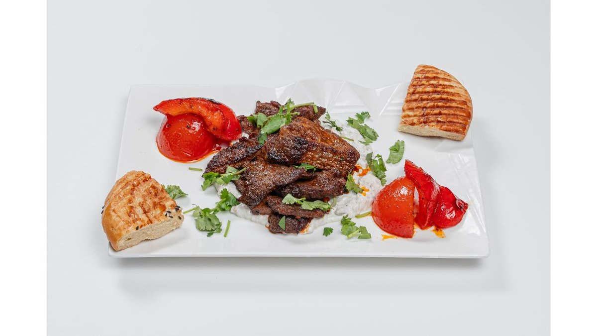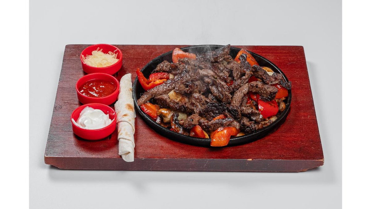Beef, bell pepper, tomato, onion, hot sauce, parmesan cheese, sour cream, lavash