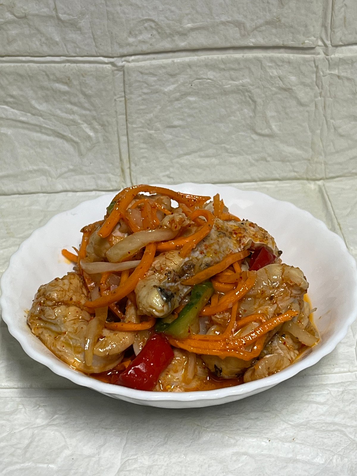 Щука, морковь, огурцы, болгарский перец, лук, специи, чеснок, растительное масло