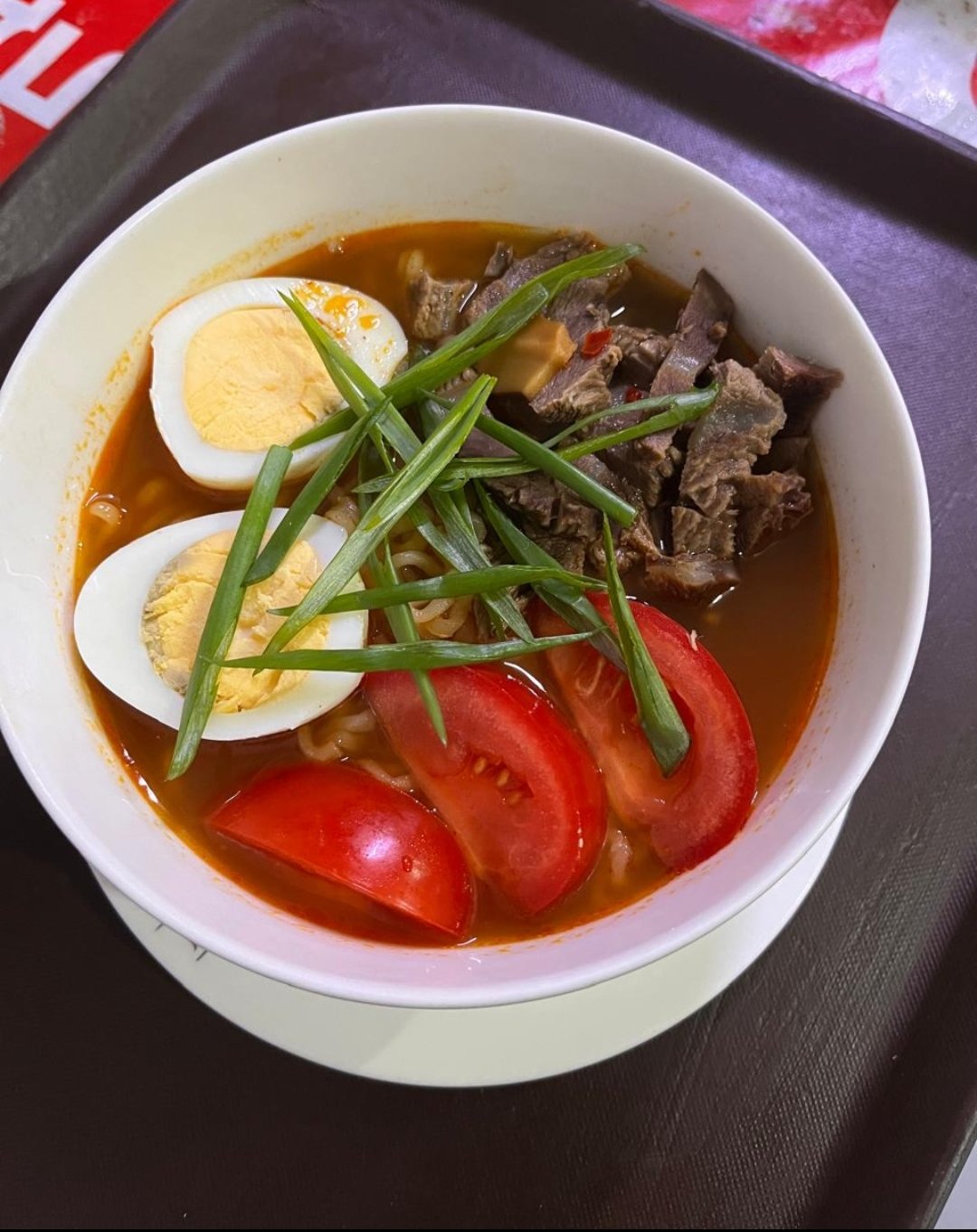 Говядина, лапша, яйцо, помидоры, зеленый лук