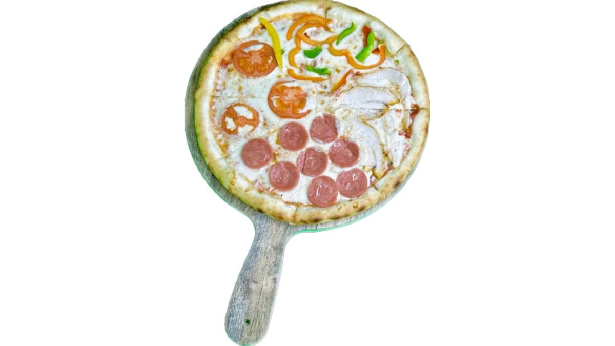 Сыр моцарелла, сыр гауда, перец светофор, помидоры, куриное филе, пепперони