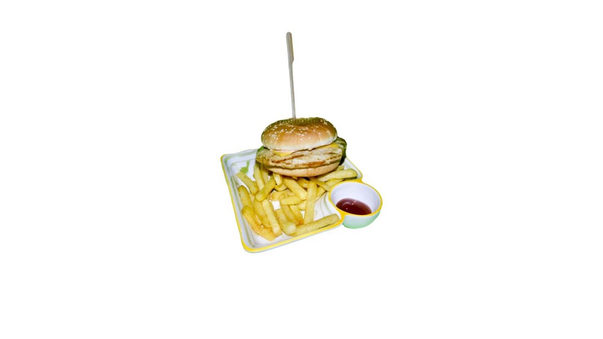 Куринная котлета, розовый соус, огурцы корнишоны, сыр, крафтвоя булочка, картофель фри, кетчуп
