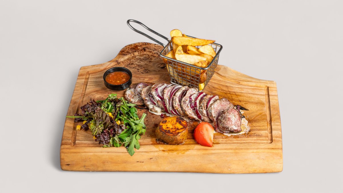 Чокертме — это изысканное турецкое блюдо, которое сочетает в себе сочность мяса и богатство восточных специй. Тонкие ломтики говядины обжариваются до золотистой корочки, оставаясь нежными и насыщенными внутри. Мясо подается с пряными овощами, такими как помидоры, перцы и лук,картофельные дольки, которые придают блюду свежесть и яркость. Легкая заправка из оливкового масла и ароматных трав делает вкус ещё более глубоким и насыщенным. Чокертме — это идеальное сочетание текстур и ароматов, которое передает суть турецкой кухни, даря невероятное удовольствие в каждом укусе.