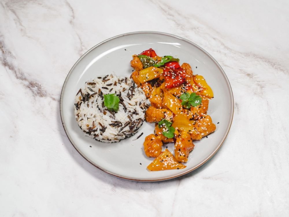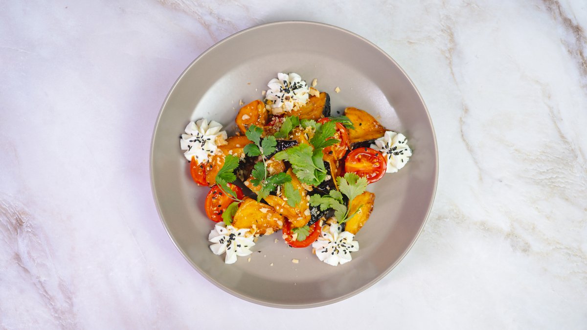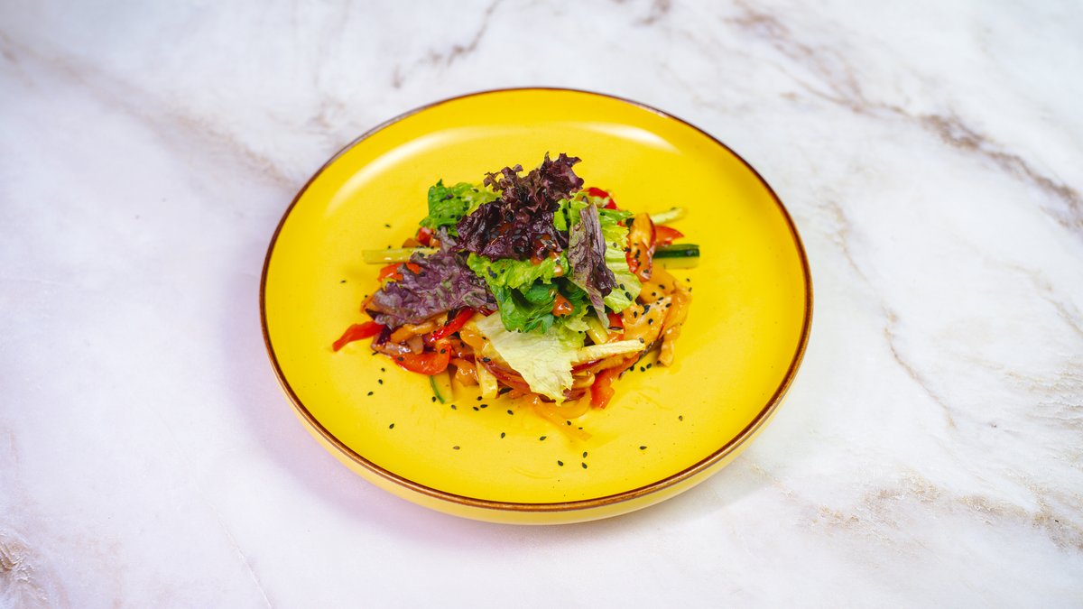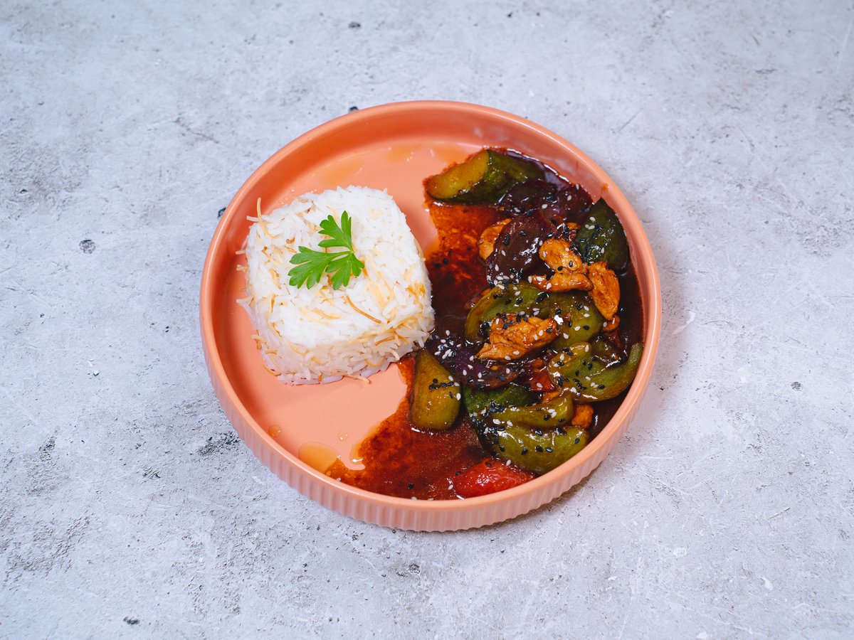 болгарский перец , баклажаны, красный лук, говядина, чеснок,микс салата, кунжутное масло,соус свит чили, помидоры,